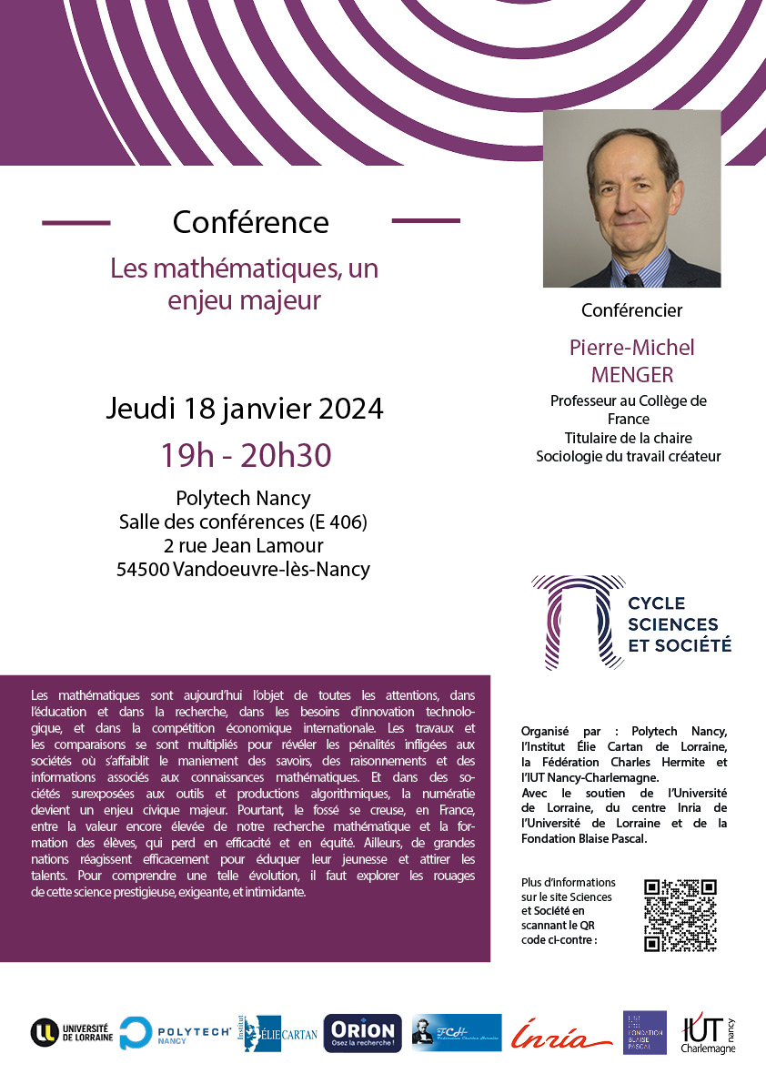 La prochaine conférence Sciences et Société aura lieu jeudi 18 janvier 2024 à 19h dans la salle des conférences (E406) de Polytech Nancy. Elle sera donnée par Pierre-Michel Menger, sociologue et Professeur au Collège de France sur le thème : Les mathématiques, un enjeu majeur.