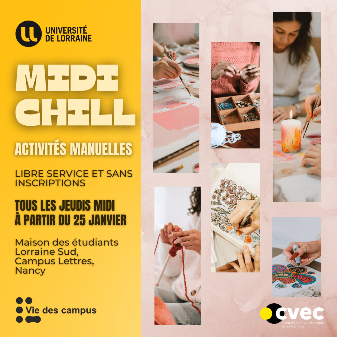 Tous les jeudis midi viens te poser autour d'une petite activité manuelle et créative à la portée de tous afin de te détendre et passer du bon temps.