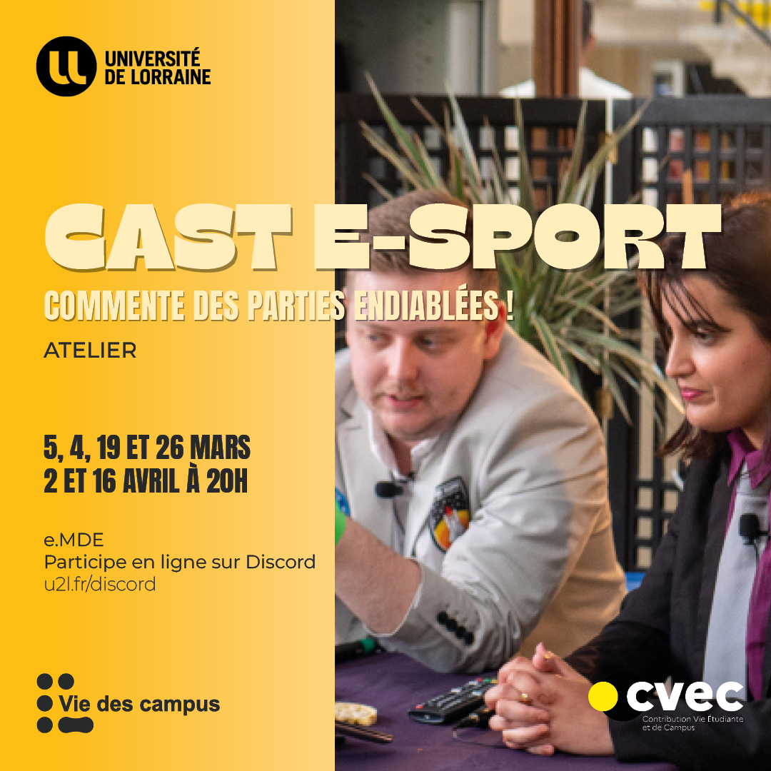 Cet atelier se déroulera sur six sessions de deux heures. Deux d'entre-elles, le 14 mars et le 16 avril , seront l'occasion de commenter en direct à distance des soirées esport à la maison de l'étudiant de Nancy !