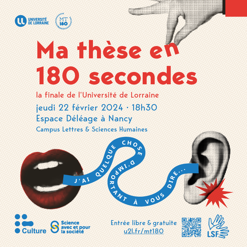 Rendez-vous le jeudi 22 février 2023 à 18h30 sur le Campus Lettres et Sciences Humaines de Nancy à l’espace Déléage, pour la finale régionale du concours Ma Thèse en 180 secondes, édition 2024.
