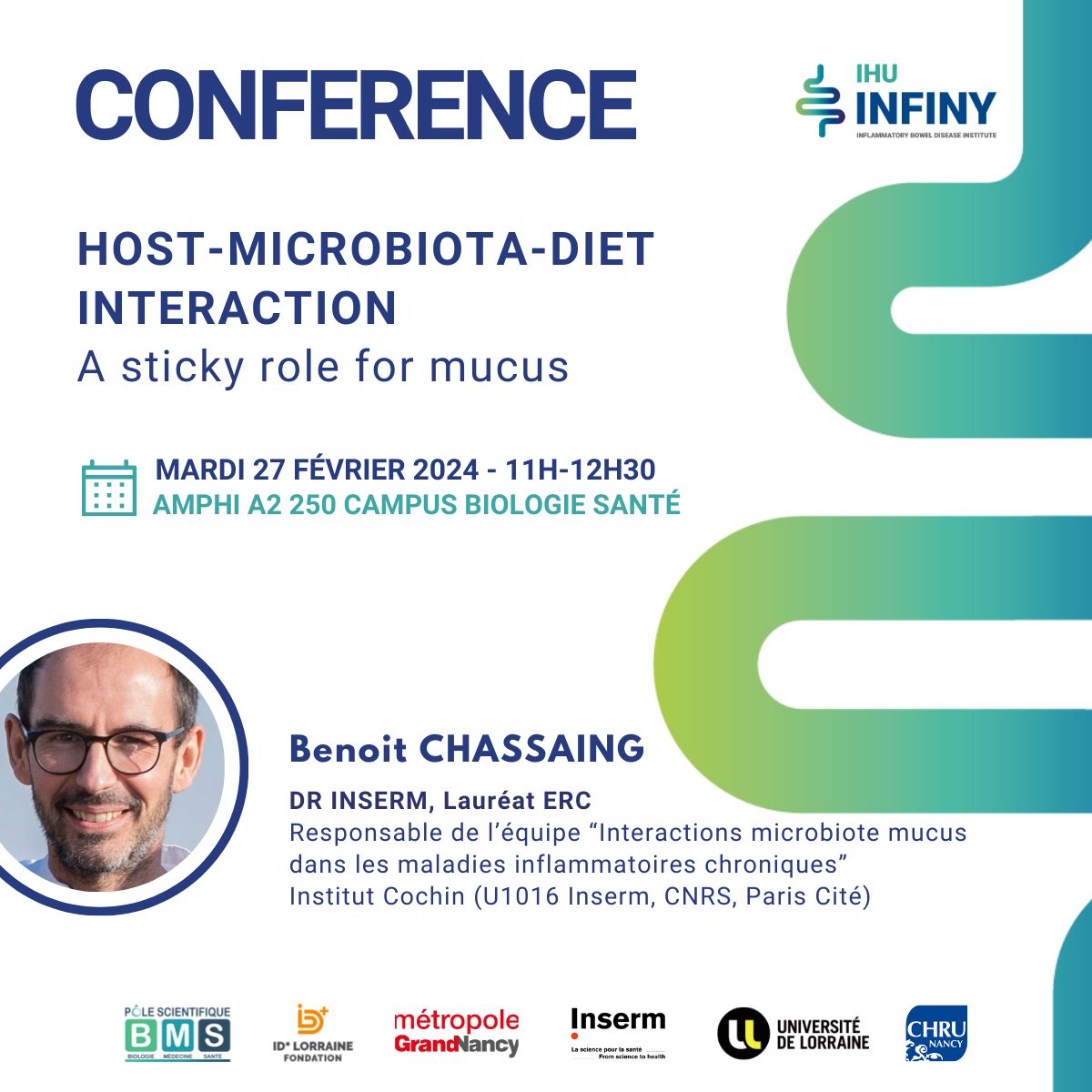 Le Dr Benoit Chassaing, Directeur de recherche Inserm, responsable de l'équipe "Interactions microbiote/mucus dans les maladies inflammatoires chroniques" à l'Institut Cochin de Paris, sera en visite à Nancy le 27 février dans le cadre de sa collaboration avec l'IHU Infiny l'institut des Maladies Inflammatoires Chroniques de l'Intestin de Nancy. Il donnera une conférence intitulée "Host-Microbiota-Diet interaction - A sticky role for mucus" à 11h dans l'amphi A2 250.
