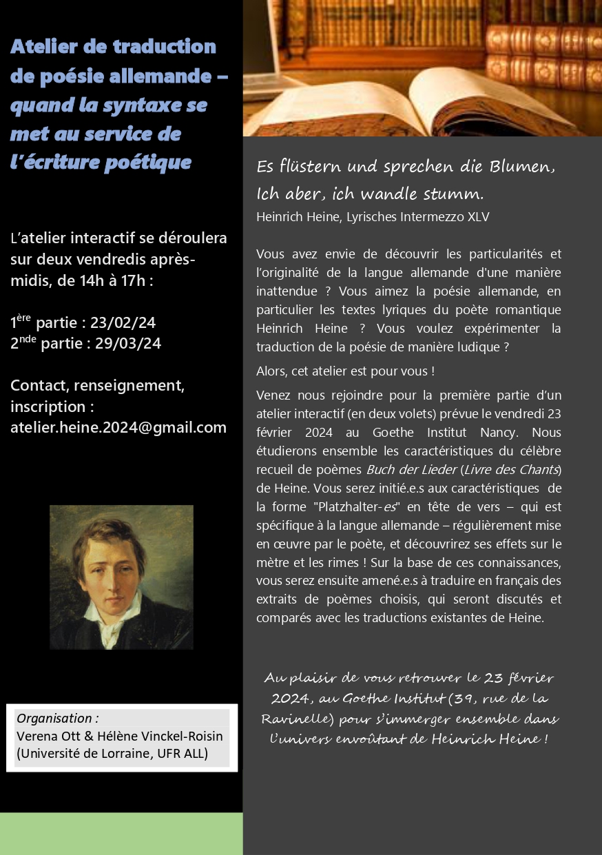 Venez nous rejoindre pour la première partie d’un atelier interactif (en deux volets) prévue le vendredi 23 février 2024 au Goethe Institut Nancy. Nous étudierons ensemble les caractéristiques du célèbre recueil de poèmes Buch der Lieder (Livre des Chants) de Heine. Vous serez initié.e.s aux caractéristiques de la forme "Platzhalter-es" en tête de vers – qui est spécifique à la langue allemande – régulièrement mise en œuvre par le poète, et découvrirez ses effets sur le mètre et les rimes ! Sur la base de ces connaissances, vous serez ensuite amené.e.s à traduire en français des extraits de poèmes choisis, qui seront discutés et comparés avec les traductions existantes de Heine.