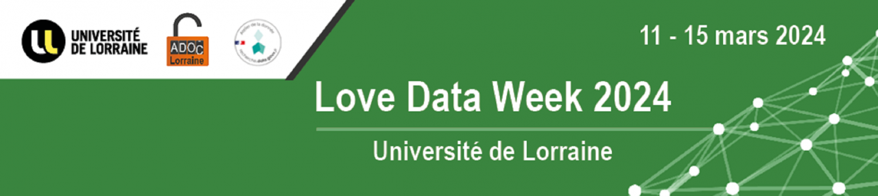 L’équipe de l’atelier de la donnée ADOC Lorraine est ravie de vous inviter à la Love Data Week 2024 de l’Université de Lorraine. Cette seconde édition se déroulera du 11 au 15 mars 2024.