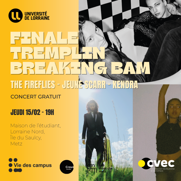 Le Crous Lorraine, l’Université de Lorraine et la Cité Musicale-Metz s’associent et proposent une soirée de concerts organisée par et pour les étudiants, à la BAM, salle de musiques actuelles à Metz, le jeudi 21 mars 2024 : Breaking BAM !