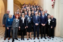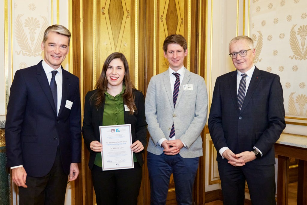 Légende de la vignette et crédits : Les lauréat*es, les partenaires économiques et institutionnels, Monsieur Stephan Steinlein, Ambassadeur de la République fédérale d’Allemagne en France, Eva Martha Eckkrammer, la Présidente de l’UFA, Philippe Gréciano, le Vice-Président de l’UFA et Carole Reimeringer, Secrétaire générale de l’UFA par intérim (© Andreas B. Krueger/DFH-UFA)