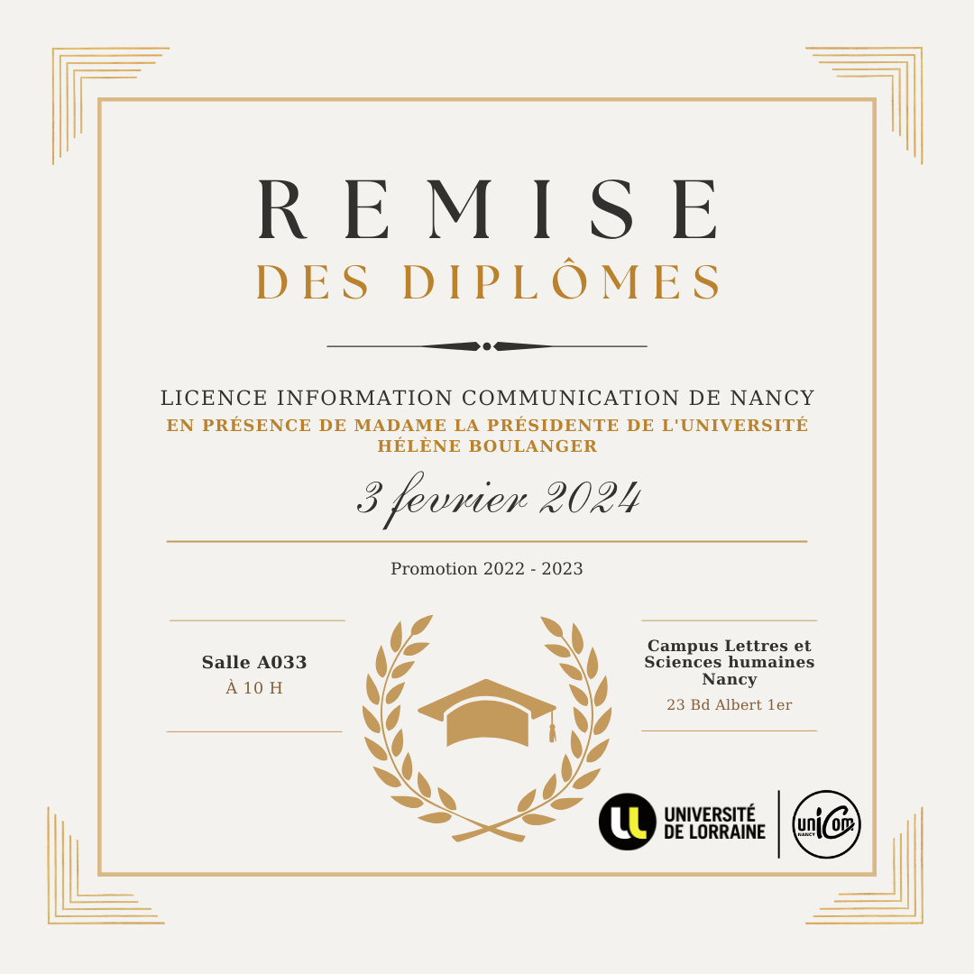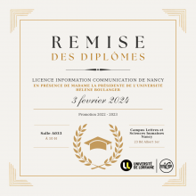 Cette cérémonie aura lieu au Campus Lettres et Sciences humaines, 23 boulevard Albert 1er à Nancy. Les licenciés ont l’occasion de venir accompagnés de leurs proches. Ils pourront y retrouver certains de leurs anciens professeurs ainsi que des membres de l’Université de Lorraine et notamment la présidente, Hélène Boulanger. Cet évènement est ouvert à tous les étudiants en information-communication et il est organisé par l’association étudiante Unicom en collaboration avec l’Université de Lorraine.