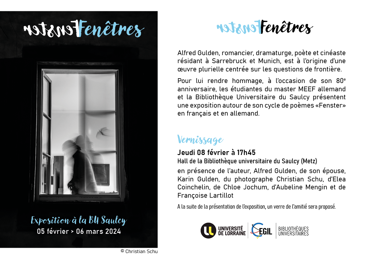 Vous pourrez y découvrir une présentation générale de l'œuvre d'Alfred Gulden dans les deux langues (français et allemand), les textes du cycle "Fenster" en allemand et en français (traduction des étudiantes), une plaquette comprenant les commentaires des étudiantes en français et en allemand, des ouvrages d'Alfred Gulden exposés par la bibliothèque, une réflexion sur le lien texte/ image, texte/tableau, texte/photographie, nourrie aussi par la présence simultanée des textes d'Alfred Gulden et des photographies de Christian Schu et des étudiantes.