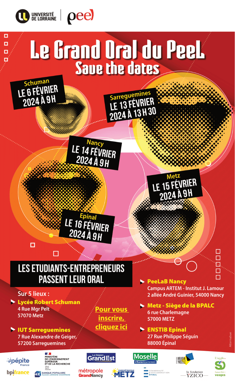 Le concept du Grand Oral du PeeL est simple, mais efficace : chaque étudiant-entrepreneur dispose d'1min30 pour présenter son projet. Après cela, le public intervient en posant ses questions. Cette approche permet des échanges riches et constructifs pour les étudiants-entrepreneurs afin de se faire connaître et faire avancer leur projet. C'est l'occasion parfaite pour approfondir les échanges, partager des idées et établir des liens.