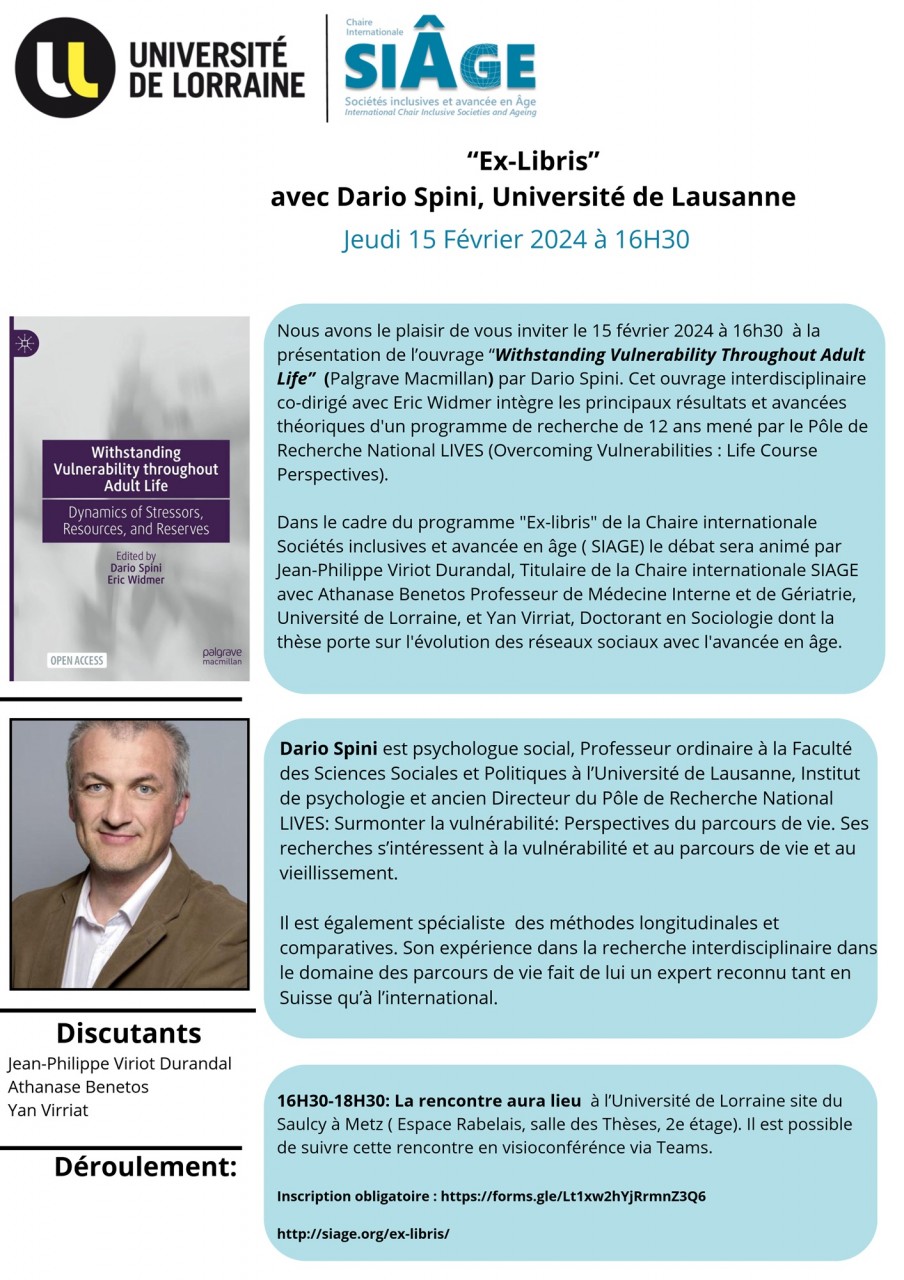 Nous avons le plaisir de vous inviter le 15 février 2024 à 16h30 à la présentation de l’ouvrage “Withstanding Vulnerability Throughout Adult Life” (Palgrave Macmillan) par Dario Spini. Cet ouvrage interdisciplinaire co-dirigé avec Eric Widmer intègre les principaux résultats et avancées théoriques d'un programme de recherche de 12 ans mené par le Pôle de Recherche National LIVES (Overcoming Vulnerabilities : Life Course Perspectives).