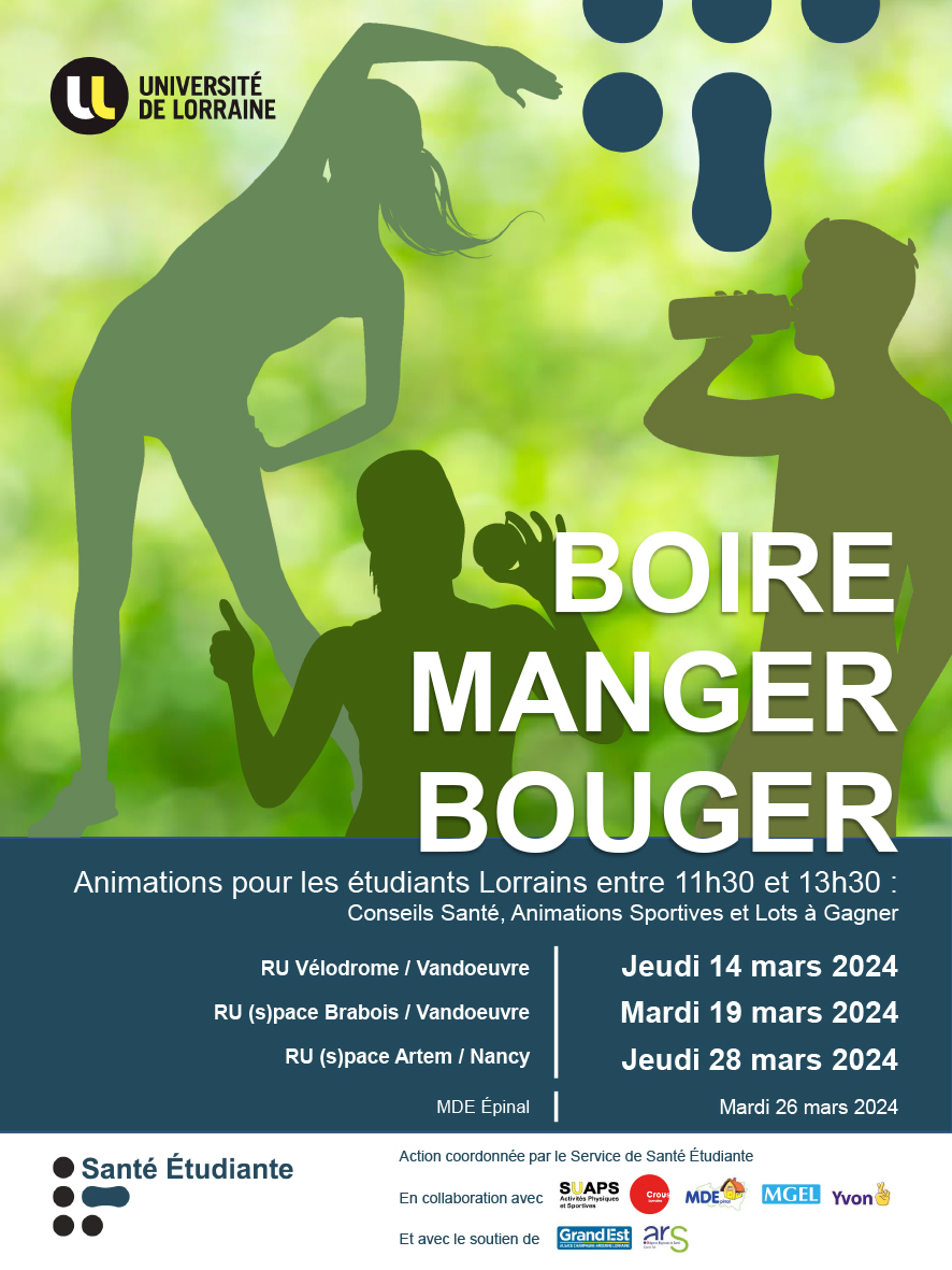 Le Service de santé étudiante site Lorraine Sud de l'Université de Lorraine, en collaboration avec la CPAM 54, le SUAPS, le Crous, la MGEL/YVON, et avec le soutien de l'ARS et de la Région Grand Est, propose aux étudiant·e·s Lorrains de Nancy une campagne de sensibilisation et de prévention sur la double thématique « Boire Manger Bouger et Garde ton sourire ».