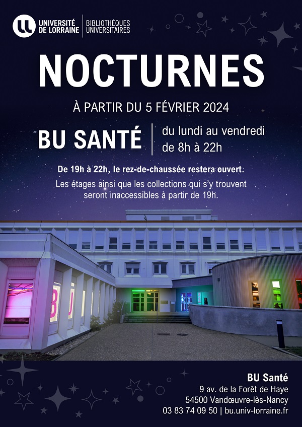 À partir du 5 février 2024, la bibliothèque universitaire de Santé de Nancy ouvre de 8h à 22h, du lundi au vendredi sans interruption.