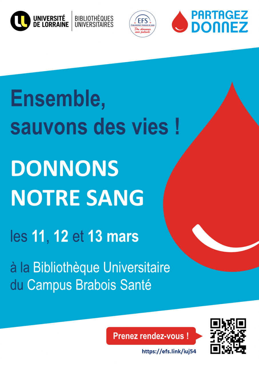 La bibliothèque universitaire de Santé accueille l'Établissement français du sang pour une collecte de sang du 11 au 13 mars 2024, en salle 2.
