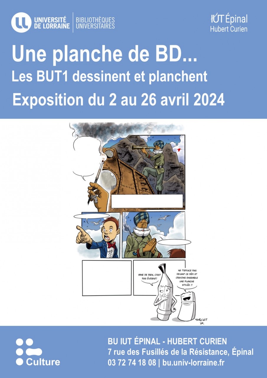 La bibliothèque de l’IUT d'Épinal vous invite à découvrir un travail sur la BD réalisé par des étudiants du BUT1 TC à partir de planches dessinées par Manu'Art, dessinateur, illustrateur et enseignant d'espagnol à l'IUT.