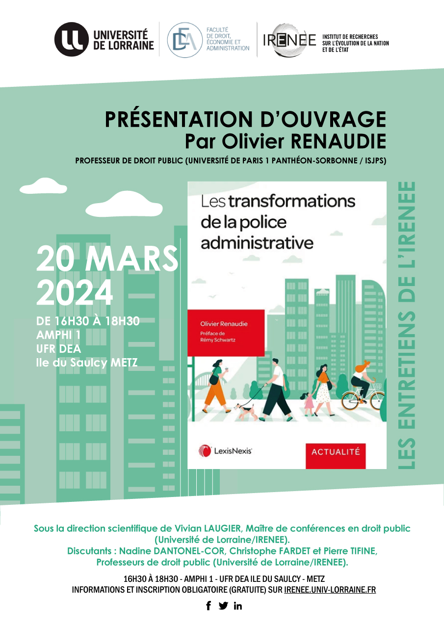 Présentation de l'ouvrage Les transformations de la police administrative (LexisNexis, 2023) par Olivier RENAUDIE, Professeur de droit public (Université de Paris 1 Panthéon-Sorbonne / ISJPS). Sous la direction scientifique de Vivian LAUGIER, Maître de conférences en droit public (Université de Lorraine/IRENEE).