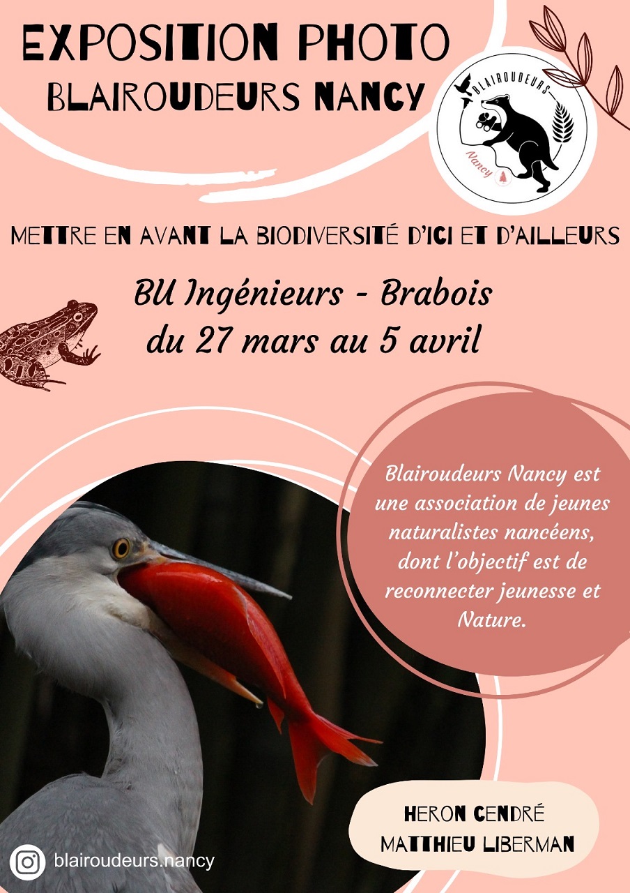 L’exposition se tient dans le cadre des Journées Arts et Culture de l’Enseignement Supérieur et s’inscrit au sein des missions de l’association Blairoudeurs Nancy, à savoir recréer du lien entre jeunesse et Nature à travers des sorties et conférences naturalistes mais aussi de la sensibilisation et de l’information. Il est essentiel pour eux de proposer une porte d’entrée pour les jeunes vers le monde naturaliste et ainsi permettre l’émerveillement et la compréhension du monde qui nous entoure. N’hésitez pas à les rejoindre !