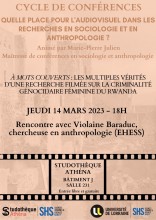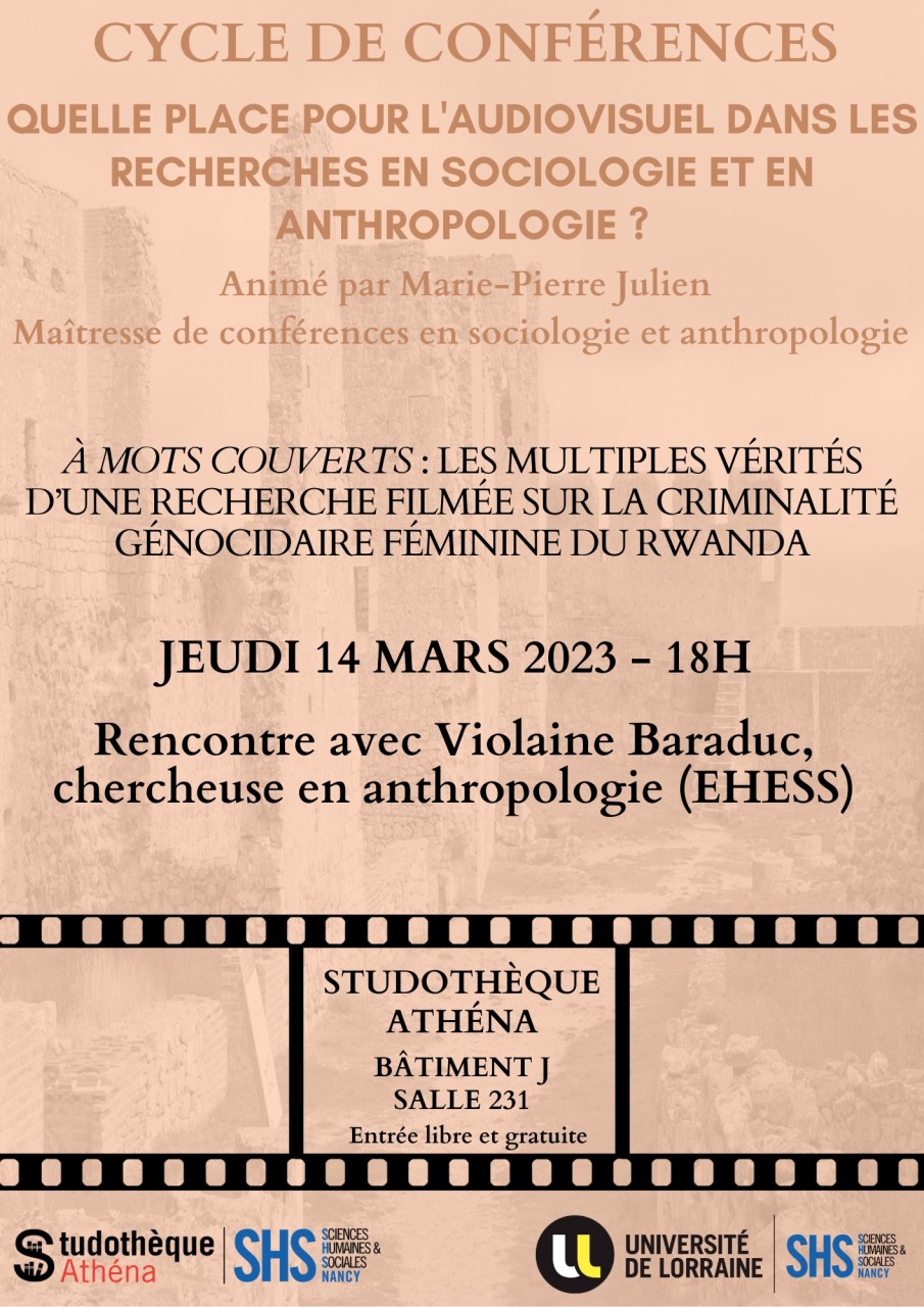 Dans le cadre de son cycle de conférences intitulé "Quelle place pour l'audiovisuel dans les recherches en sociologie et en anthropologie ?" et animé par Marie-Pierre JULIEN (maîtresse de conférences en sociologie et anthropologie à l'Université de Lorraine), la Studothèque Athéna vous propose une rencontre avec Violaine BARADUC intitulée "À mots couverts : les multiples vérités d’une recherche filmée sur la criminalité génocidaire féminine du Rwanda".