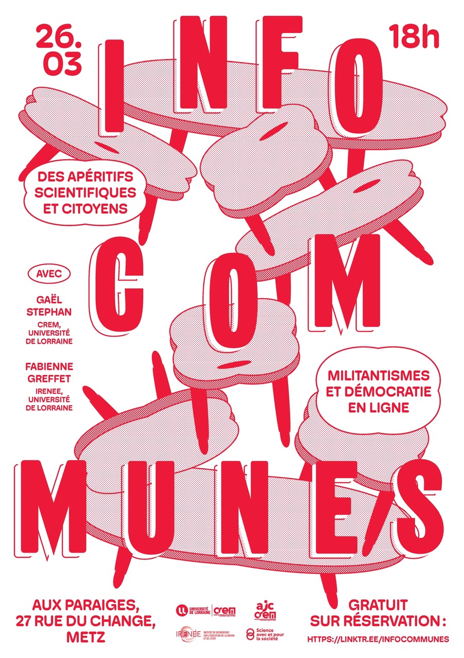 Les infocommunes, portées par les doctorants en Sciences de l’Information et de la Communication de l’AJC Crem, sont l’occasion de partager un verre et des réflexions informelles avec des scientifiques de différentes disciplines. Sans hiérarchie et sans tabous, ces rendez-vous vous font découvrir les Sciences de l’Information et de la Communication, interrogent leurs liens avec les autres sciences, et surtout, placent la recherche au coeur des problématiques sociétales les plus proches de vous.