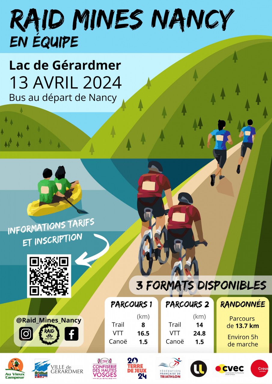 Cette année, le RAID Mines Nancy a lieu le samedi 13 avril 2024 et se déroulera dans les environs du lac de Gérardmer ! La toute nouvelle édition préparée par l'association étudiante des Mines de Nancy vous réserve une expérience inédite. Venez profiter d’un moment sportif inoubliable autour du plus grand lac naturel des Vosges. Différents parcours adaptés à tous les niveaux vous sont proposés : un parcours RAID au format grand ou petit et un parcours randonnée. Si vous choisissez le parcours RAID vous affronterez, par équipe de 2, les autres lors d’une course multi-épreuves qui comprend trail, VTT et canoë. Pour celles et ceux qui souhaitent découvrir la région plus tranquillement, la randonnée proposée par le RAID est faite pour vous. Vous visiterez les plus beaux points de vue des environs, à travers forêts et cascades. Les inscriptions sont ouvertes sur notre site internet où vous trouverez les tarifs et autres informations complémentaires.