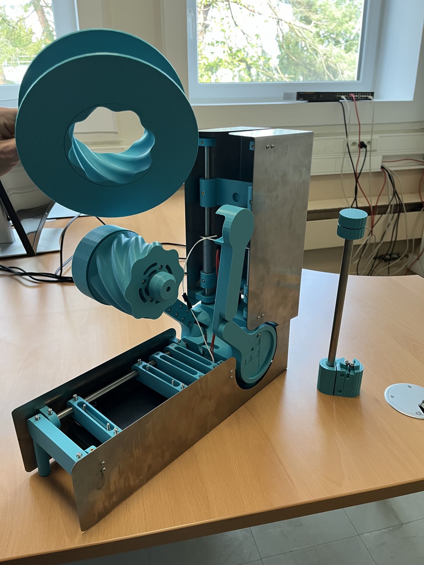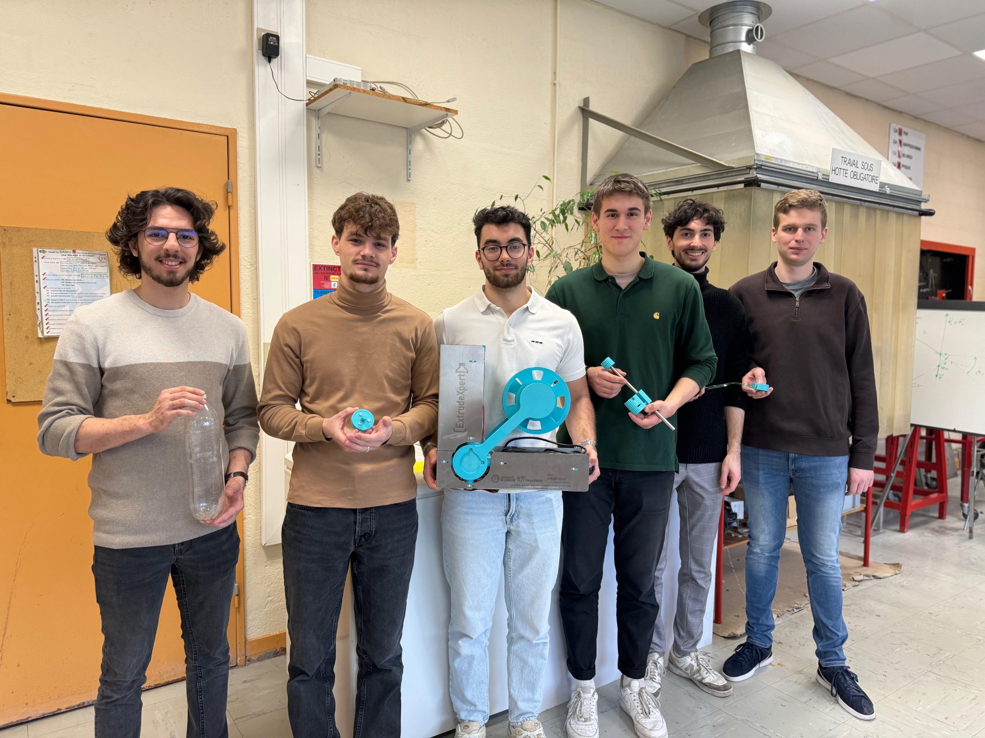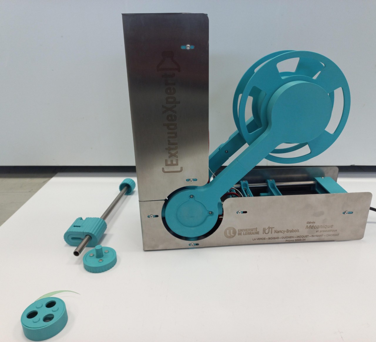 Les étudiants de 3ème année du BUT (Bachelor Universitaire de Technologie) Génie Mécanique et Productique (GMP) de l’IUT Nancy-Brabois ont réalisé des prototypes de machines permettant d’obtenir du fil plastique de 1,75 mm de diamètre pour imprimante 3D à partir de la découpe de bouteille plastique (bouteille nettoyée, soufflée et découpée en lamelles de largeur de 6mm environ). Ce projet a été réalisé dans le cadre des SAé (Situation d’Apprentissage et d’évaluation) 5.01 et 6.01 (fournir en autonomie une solution fonctionnelle et optimisée répondant à une demande industrielle). Il représente un volume horaire estimé à 135 heures par étudiant (65 heures au premier semestre, 70 heures au deuxième semestre). Les prototypes ont été réalisés par groupes de 3 à 6 étudiants issus des parcours Innovation pour l’Industrie (II), Simulation Numérique et Réalité Virtuelle (SNRV) et Management de Process Industriel (MPI) du BUT GMP ce qui conférait à chaque équipe toutes les compétences nécessaires pour la réalisation d’un projet industriel. Le projet s’est donc déroulé en deux parties : SAé 5.01 pour la détermination du besoin et proposer des solutions sur la base d’une machine déjà existante, ici le POLYFORMER (https://github.com/Reiten966/Polyformer) ; SAé 6.01 pour définir la stratégie de production optimale et la réalisation.