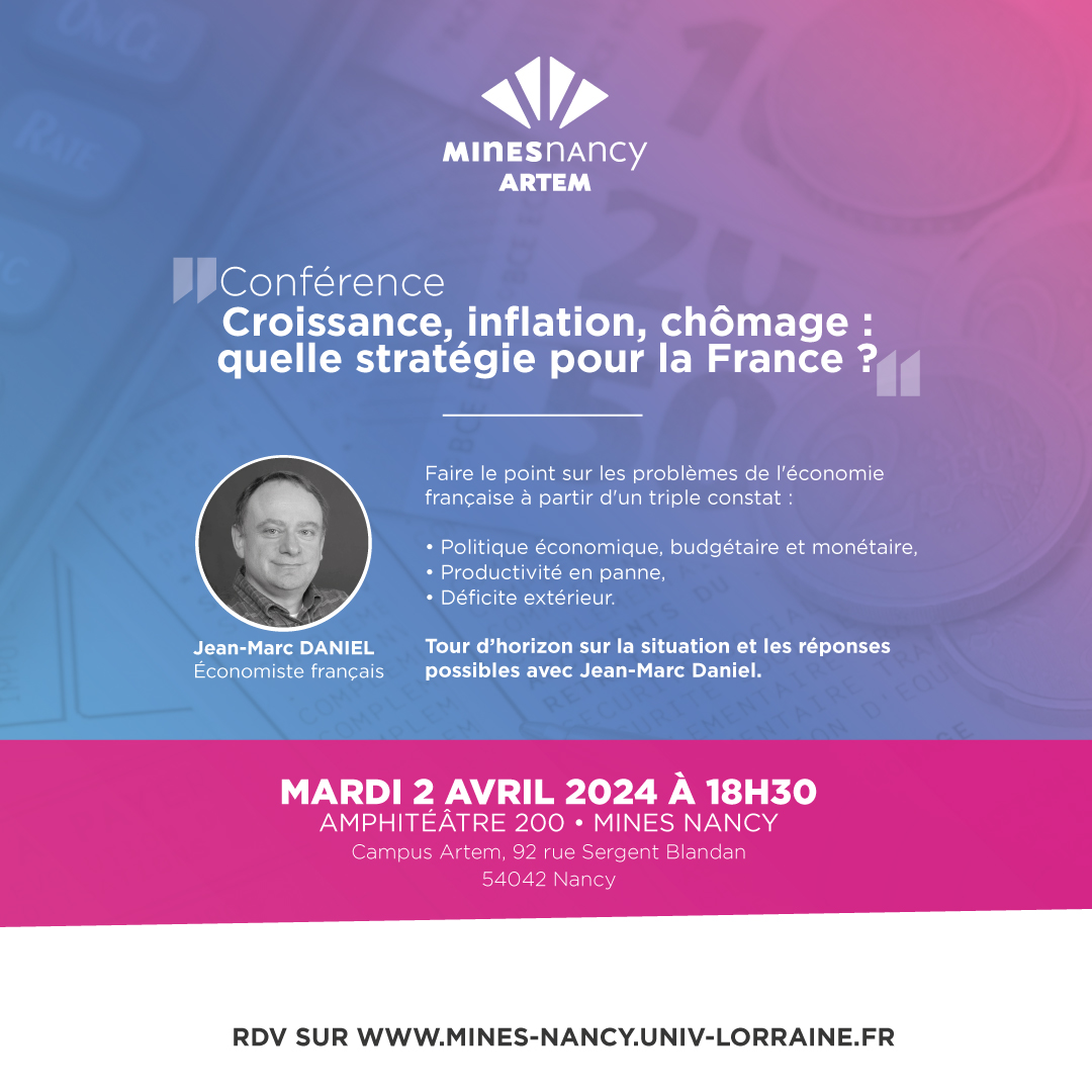 Mines Nancy organise le 2 avril à 18h30, une conférence sur l’économie française « Croissance, inflation, chômage : quelle stratégie pour la France ? » avec comme invité Jean-Marc Daniel, Économiste français.