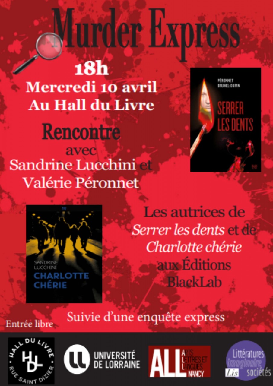 Les étudiantes de M1 TIE Lettres Pro vous proposent une "murder express" le mercredi 10 avril à 18h au Hall du livre. Cet événement littéraire est une rencontre avec Sandrine Lucchini, autrice de Charlotte Chérie et Valérie Péronnet, autrice de Serrer les dents, aux Éditions Black Lab.