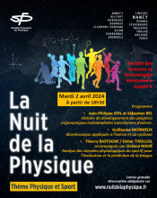 À l'occasion de l' « Année de la Physique » et dans la perspective des Jeux Olympiques et Paralympiques 2024, la Société Française de Physique (SFP) organise une Nuit de la physique, sur le thème « Physique et Sport », le 2 avril 2024. La section lorraine de la SFP, avec le soutien du CNRS, de l’Université de Lorraine, de l’Institut Jean Lamour et du Département de Physique de la Faculté des Sciences et Technologies, s'associe à cet événement national et propose une Nuit de la Physique nancéienne le 2 avril 2024. Cet événement, ouvert à tous les étudiants et au personnel de l’Université de Lorraine et sur inscription uniquement, offre une opportunité unique de découvrir les liens entre la physique et le sport.