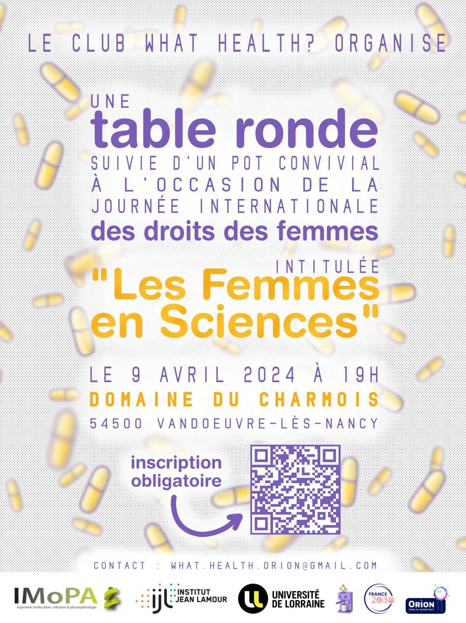 Cette table ronde est organisée par le club ORION étudiant·es-chercheur·ses What Health?, dont le but est de promouvoir la recherche pour la santé auprès des étudiants de l'Université de Lorraine de la L2 au M2, porté par quatre femmes scientifiques issues de deux laboratoires de recherche Lorrains :
