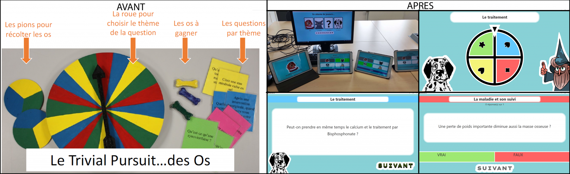 Le jeu du « Trivial pursuit des os » à destination de patients atteints d’ostéoporose a été choisi en guise de test. Ce jeu consiste en une série de questions liées à l’ostéoporose pour voir ce que les patients ont retenu dans les différents ateliers. Les patients doivent répondre à un nombre défini de questions dans différentes catégories. À chaque bonne réponse, ils remportent un os de la couleur de la catégorie. Une première version numérique de ce jeu, ludique, ergonomique et pédagogique a été conçue en collaboration avec des étudiants en master Informatique spécialisés en Interaction Humain-Machine et des étudiants du master Métiers de l’Enseignement, de l’Éducation et de la Formation spécialisés en Ingénierie Pédagogique. Une conception centrée utilisateur a permis de capturer les besoins des utilisateurs. Chaque patient dispose d’une tablette pour répondre aux questions choisies au hasard en tournant une roue virtuelle. Une vue globale est proposée en parallèle sur un grand écran contrôlé par le personnel soignant animateur. L’application est accessible aux personnes âgées : des gestes tactiles simples, une grande taille de texte et une visualisation non ambiguë avec des couleurs accessibles complétées par des symboles. Des maquettes ont été aussi réalisées pour montrer les futures itérations possibles de l’application.