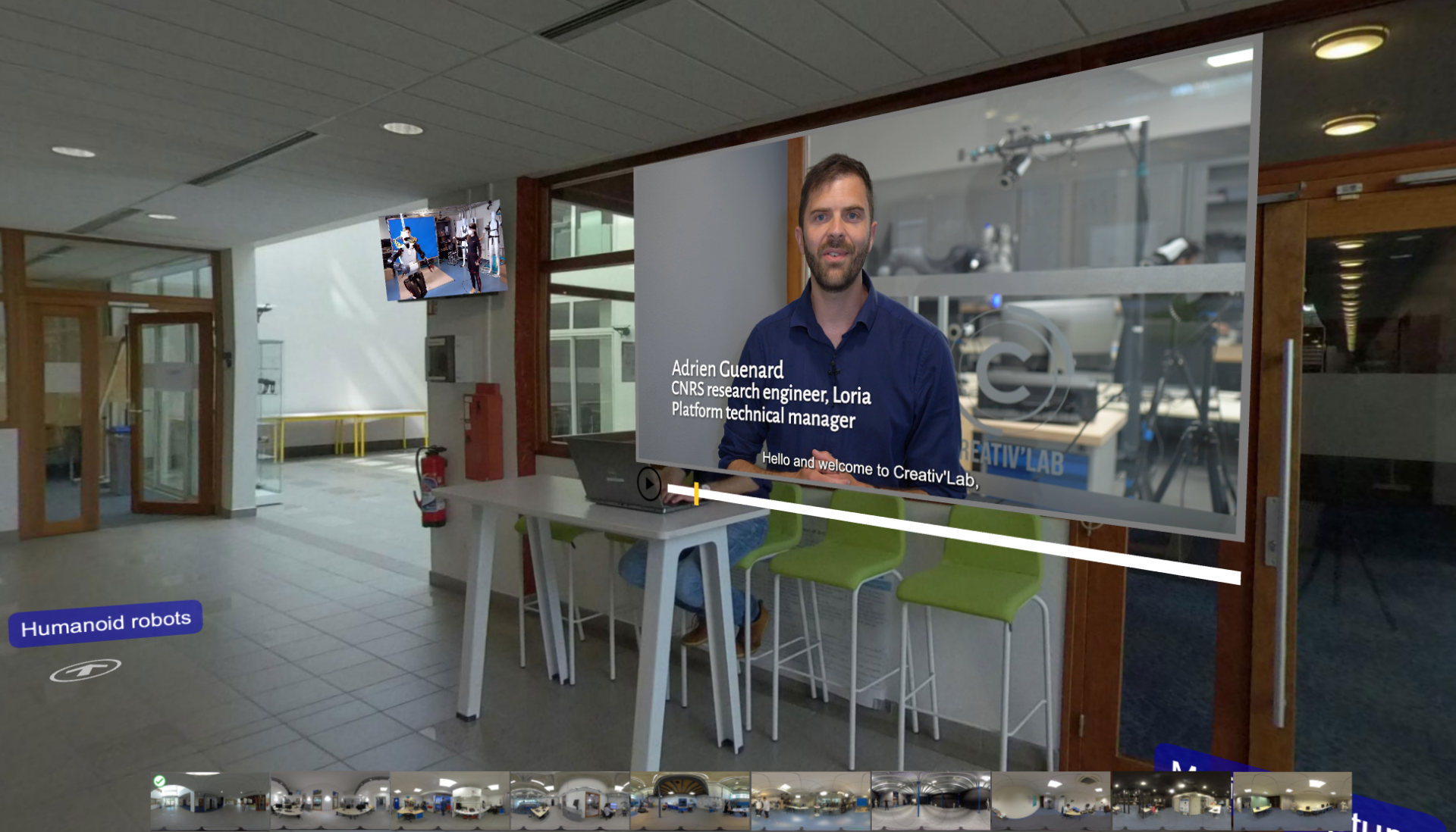 Grâce à cette visite virtuelle à 360° développée par l'Université de Lorraine, immergez-vous au cœur de nos travaux à travers des vidéos, démonstrations et projets de recherche. Accompagnés des chercheurs, enseignants-chercheurs, ingénieurs et doctorants de nos équipes, naviguez à travers les salles d'expérimentation en robotique industrielle, impression 3D, robotique humanoïde, capture du mouvement, neurosciences, biorobotique ou encore dans une volière à drones et dans notre plateforme multimodale pour l'acquisition de la parole.