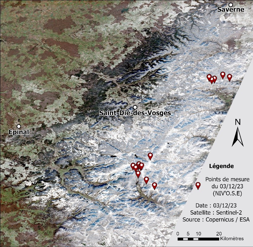 Figure ci-dessus : Localisation des mesures effectuées par les citoyens-bénévoles de l’association Niv’ose lors de la campagne du 3 décembre 2023, au moment du passage du satellite Sentinel-2.