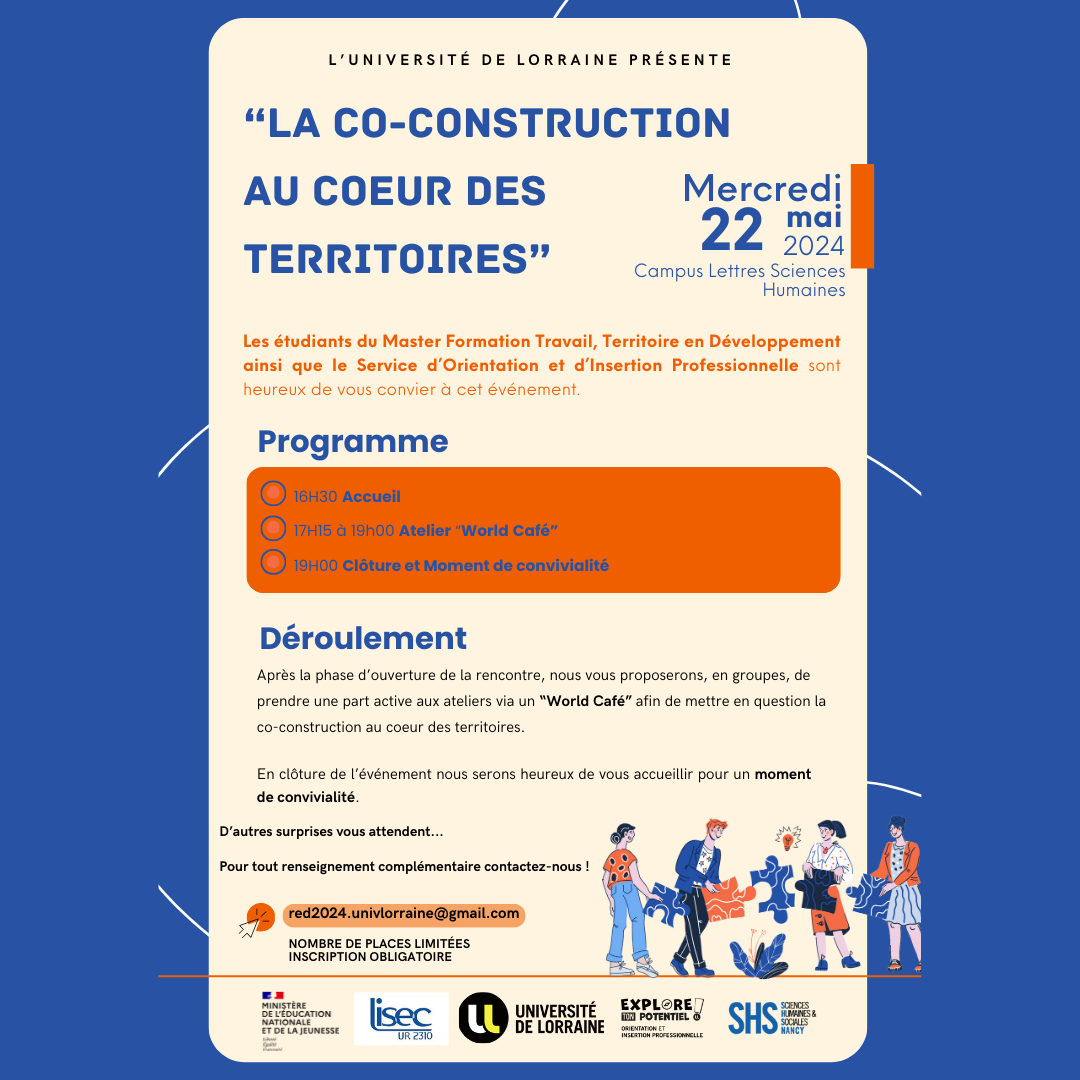 Les étudiants du Master 2 - Formation, Travail, Territoires en Développement (F2TD ou Proj’Ter) de l'Université de Lorraine en partenariat avec le SOIP sont heureux de vous inviter à échanger ensemble autour de ce thème.