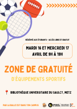 LA BALLE EST DANS TON CAMPUS invite tous les étudiants les mardi 16 et mercredi 17 avril 2024 à une distribution gratuite de vêtements et d'équipements sportifs à la Bibliothèque Universitaire du Saulcy à Metz.