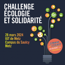 La 12e édition du Challenge Écologie et Solidarité présente les projets d'étudiantes et d'étudiants de toutes les formations, de la L1 au doctorat, de l'Université de Lorraine et d'ailleurs, qui portent un projet en lien avec les enjeux écologiques et solidaires. Le 28 mars 2024, ce sont quatorze projets qui concourait sur 4 thématiques, dans les locaux de l'IUT de Metz :