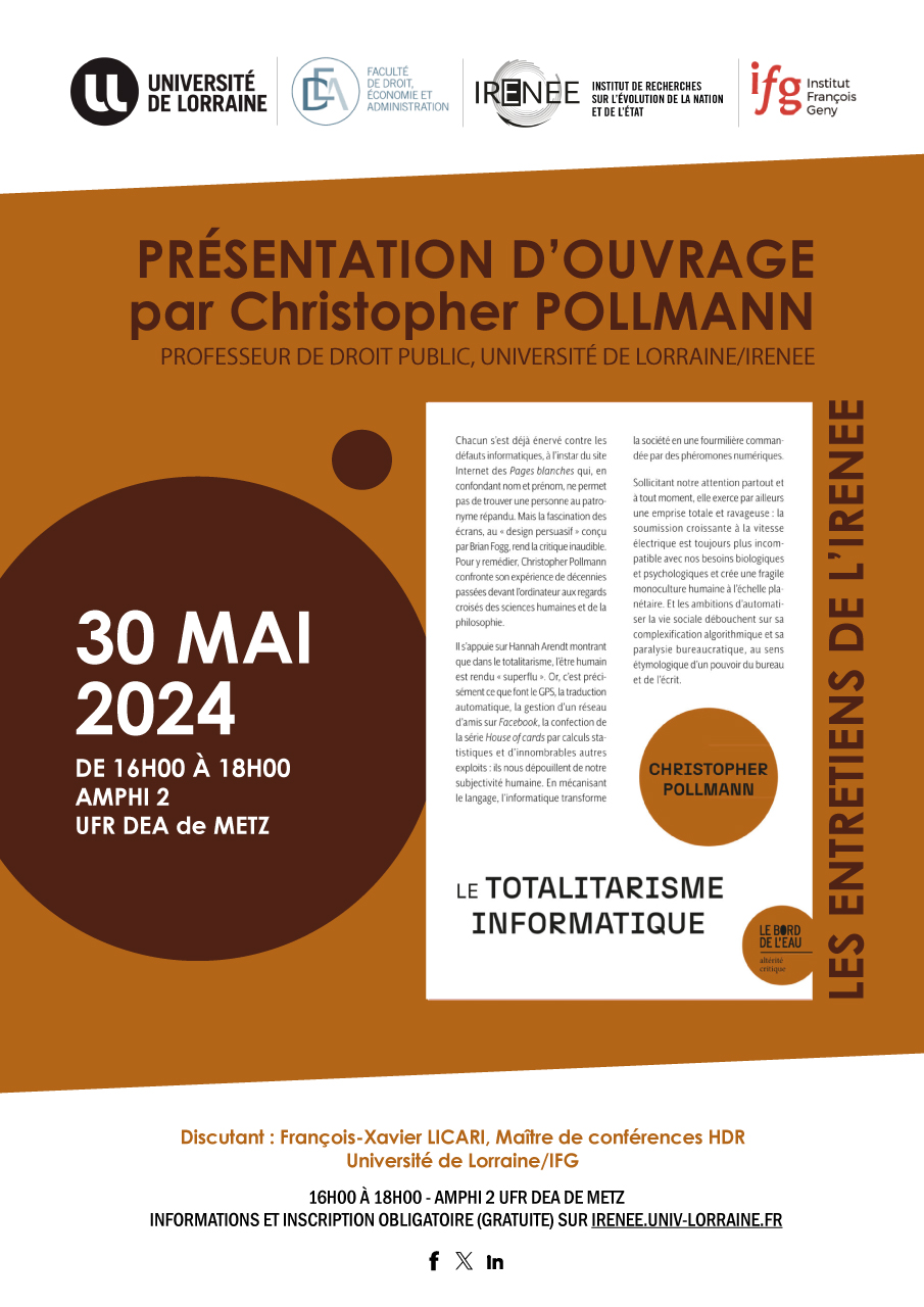 Présentation de l'ouvrage Le totalitarisme informatique (Bord De L'eau, 2024) par Christopher POLLMANN, Professeur de droit public (Université de Lorraine/IRENEE).