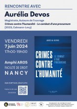 Aurélia Devos - 1ère vice-présidente adjointe et présidente de la 5ème chambre correctionnelle du TJ de Lille - a dirigé pendant 8 années le parquet du pôle Crimes contre l’humanité. Elle viendra le 7 juin à Nancy présenter son livre Crimes contre l’humanité - Le combat d'une procureure (2023, Calmann-Lévy). Il sera question de la justice pénale internationale en France au cours d’un débat animé par Delphine Brach-Thiel, maître de conférences, spécialisée en droit pénal international et directrice du Master 2 Droit pénal international et financier.