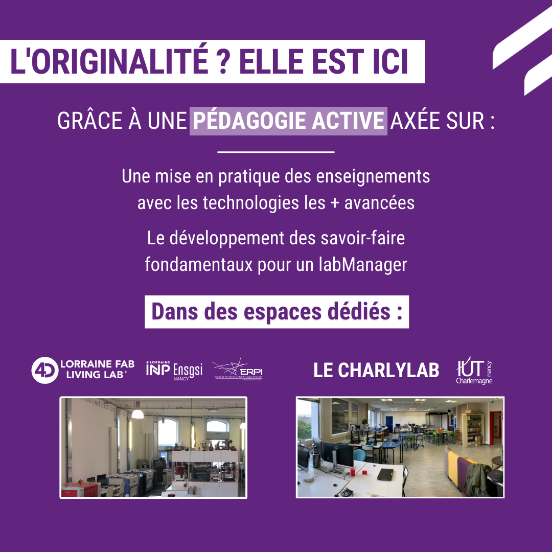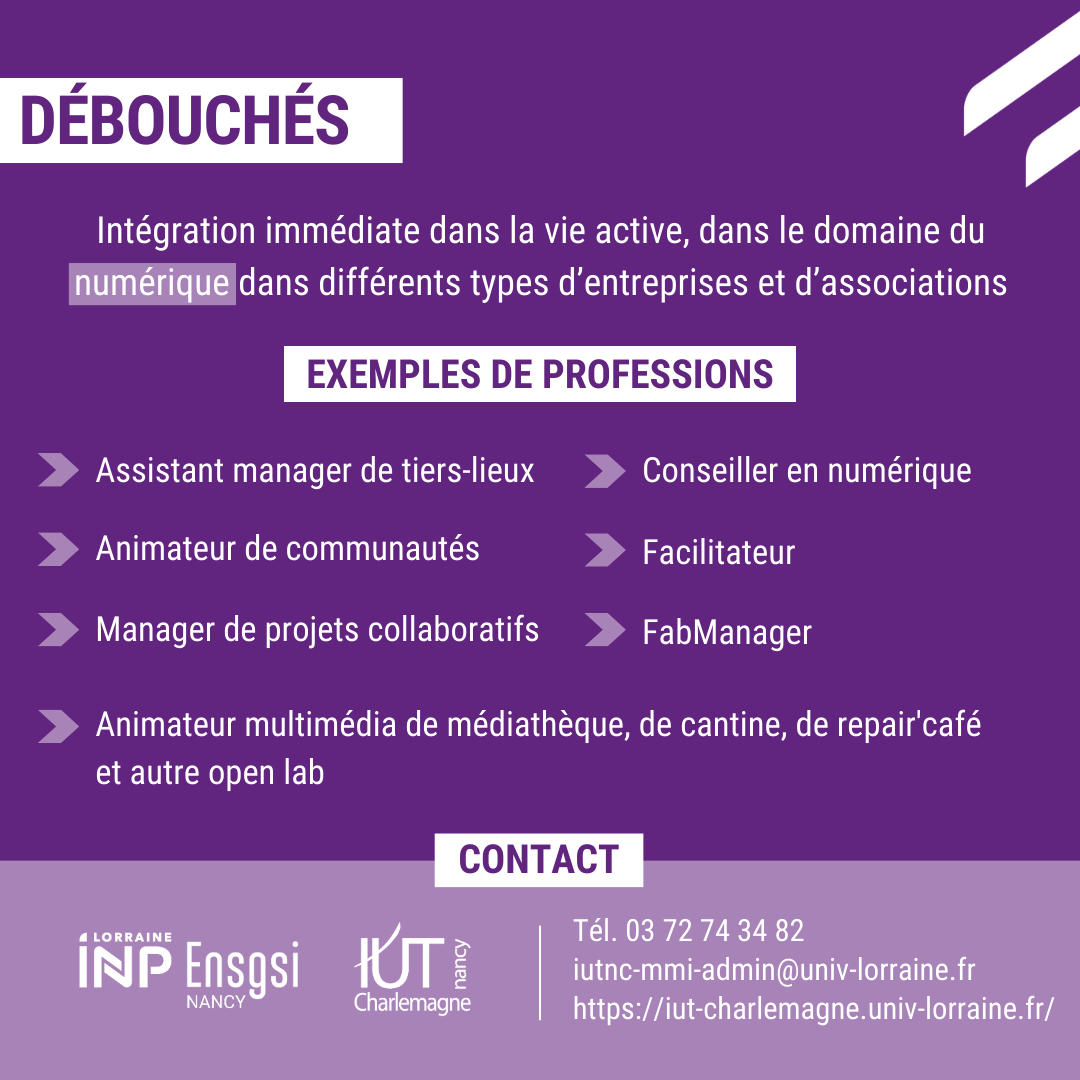 L'IUT Nancy-Charlemagne et l'École Nationale Supérieure en Génie des Systèmes et de l'Innovation (ENSGSI) proposent, en partenariat, la licence professionnelle Animateur Facilitateur de Tiers-Lieux Éco-responsables.