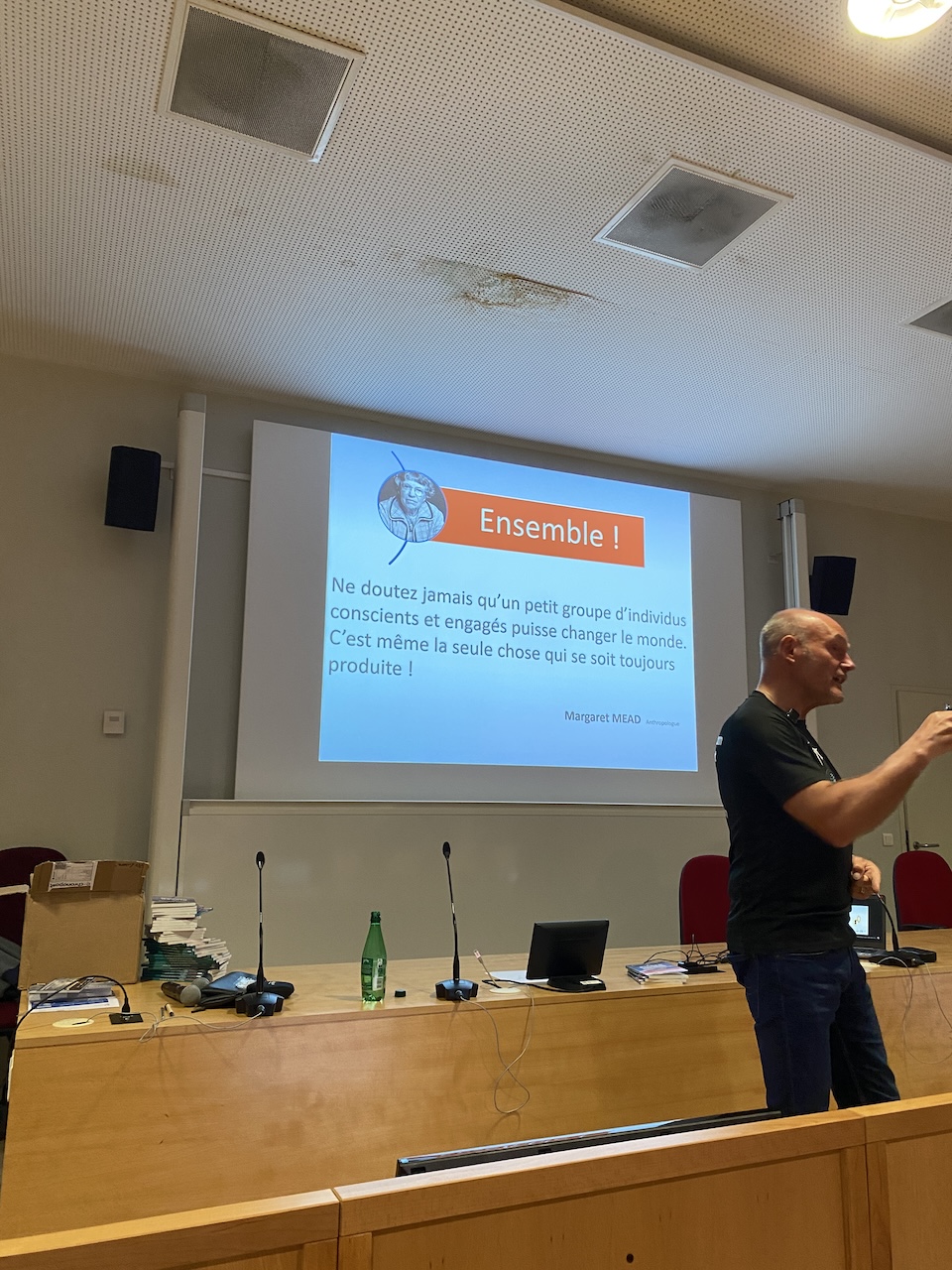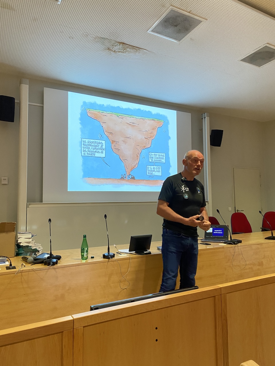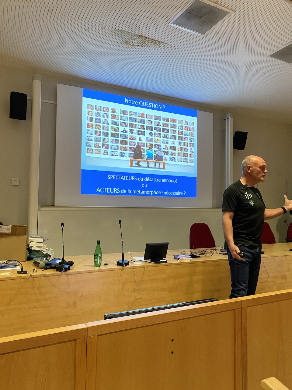Accueilli par Guillain Mauviel, vice-président transition écologique, et Vincent Queudot, directeur général de la Fondation ID+ Lorraine, Philippe Moreau commence sa conférence par un court film choc et enchaîne : “On est en train de tout foutre en l’air. Ça tient encore debout mais il faut agir autrement. On a un modèle : dame nature qui sait jouer le jeu de l’équilibre. On ne peut que constater que l’homme fait tout l’inverse.”