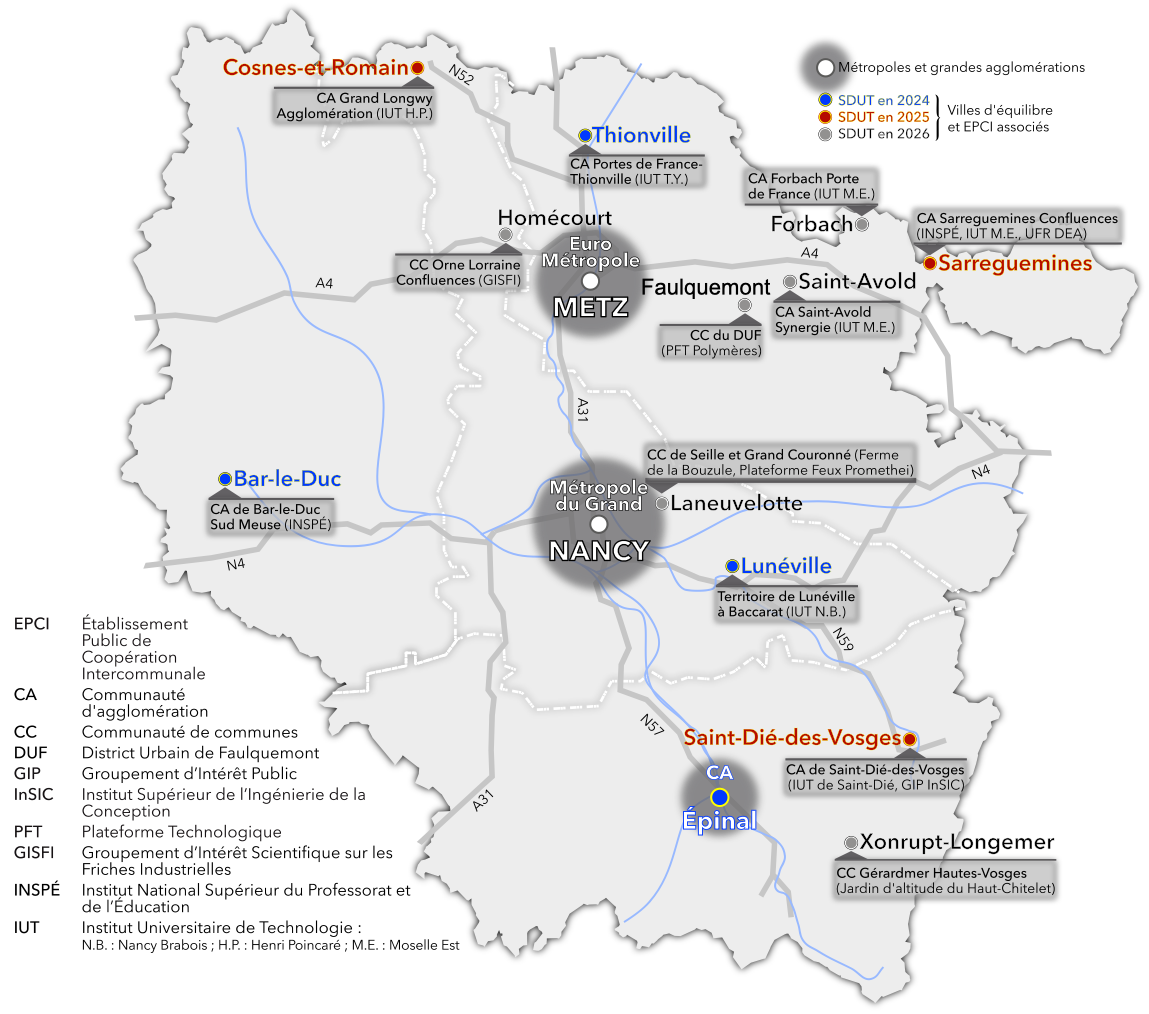 La stratégie territoriale est déclinée et adaptée pour chaque territoire sous la forme d’un schéma de déploiement universitaire territorial (SDUT@UL) qui permet de fixer les objectifs communs et de partager les actions qui en découlent en matière d’orientation, de formation (au sens large), de recherche, d’innovation, de vie universitaire et/ou de liens entre science et société.