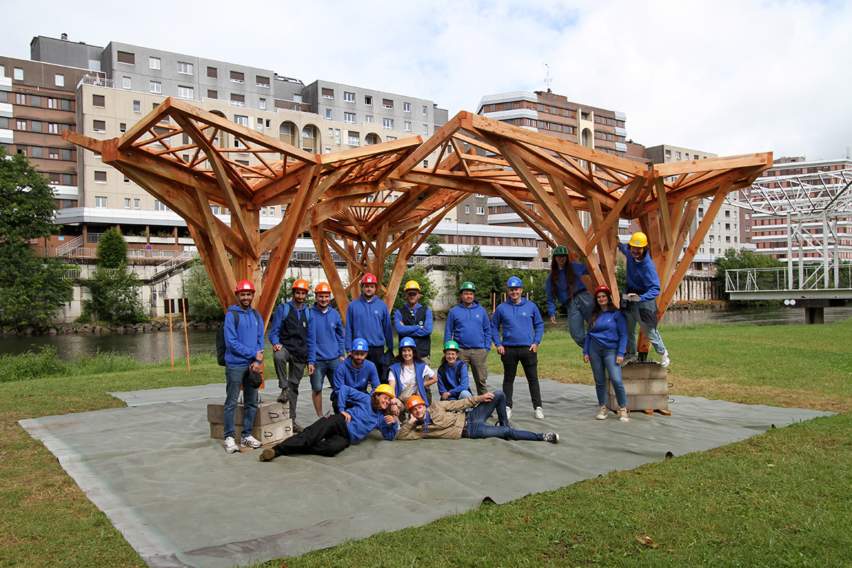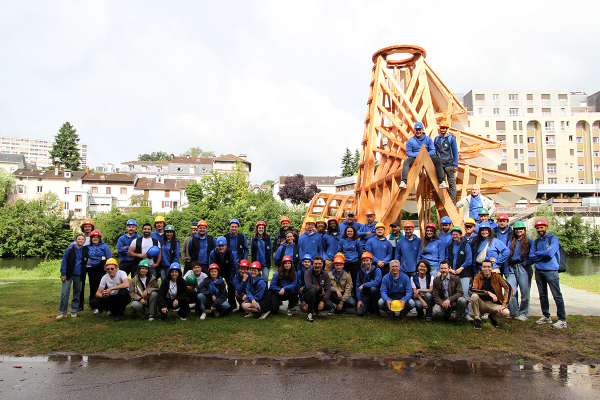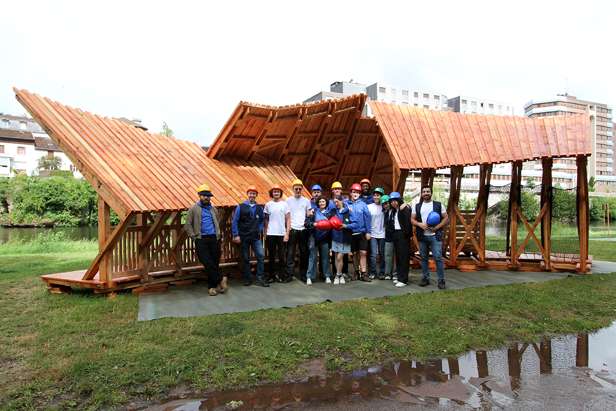 Du 8 au 15 juin 2024, 45 jeunes architectes, ingénieurs et compagnons du devoir, ont construit 3 structures en bois dans le Parc du Cours d'Epinal, dans les Vosges, sur le thème du jumelage et de l'amitié entre les peuples d'Europe. C'était la 20e édition des Défis du Bois, portés par l'ENSTIB, dans le cadre du Master ABC (Architecture, Bois, Construction), en collaboration avec l'Ecole Nationale Supérieure d'Architecture de Nancy et les Compagnons du Devoir Grand-Est. La Ville d'Epinal était le commanditaire de ces trois réalisations, dont l'une restera à Epinal, tandis que les deux autres iront à Gembloux (Belgique) pour fêter les 50 du jumelage et à Schwäbisch Hall (Allemagne) pour le 60e anniversaire.