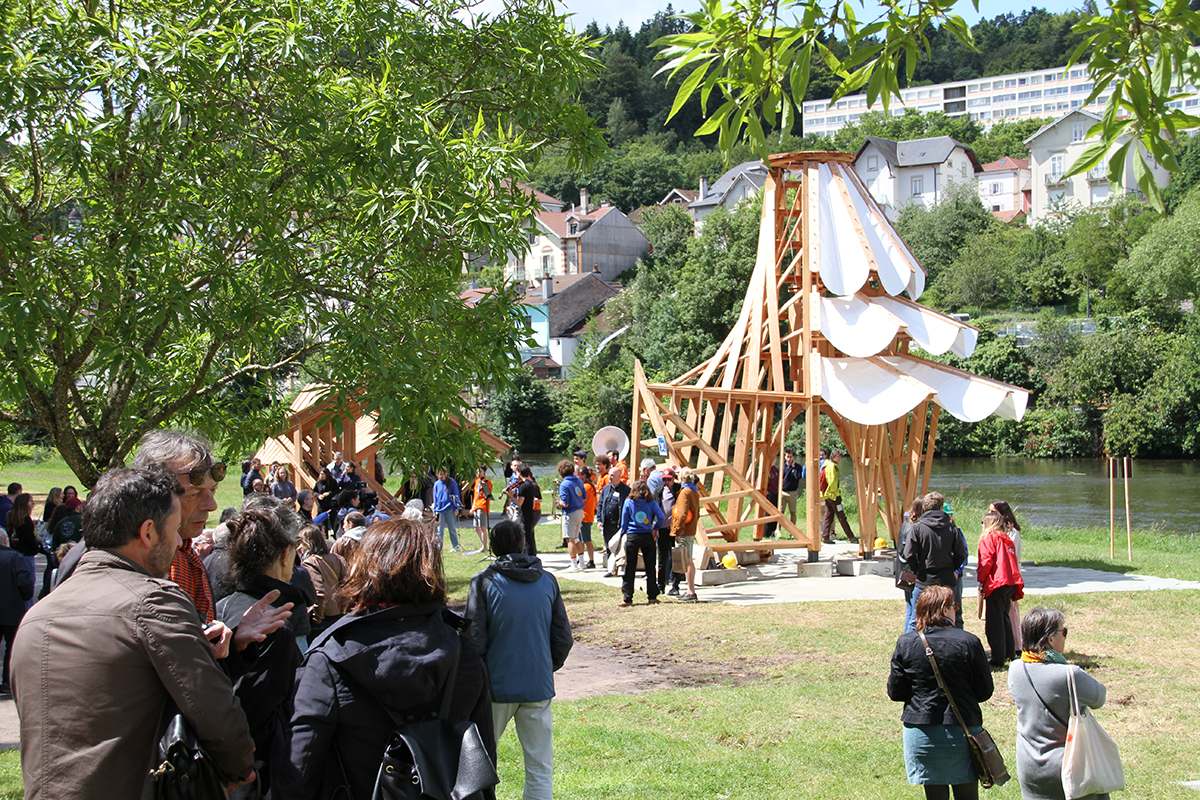 Après une phase de pré-assemblage des trois structures « commandées » aux Défiboiseurs, ces derniers ont travaillé dans relâche, durant la semaine de construction organisée le long de la Moselle, dans le Parc du Cours à Epinal. Les engins d’élévation, et notamment une grue mise à disposition par l'entreprise KLAAS ont permis d’assembler les différents éléments de ces œuvres en trois parties.
