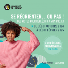Pas de panique, l’Université de Lorraine vous accompagne dans la construction (éventuelle) d’un nouveau projet - à l’université ou en dehors - avec « Se réorienter … ou pas ! Des pistes pour réfléchir à mon projet ».