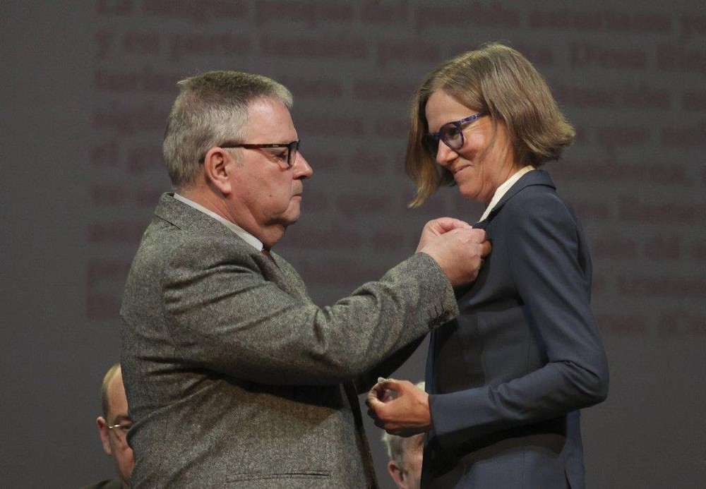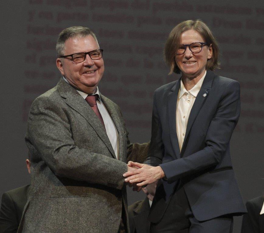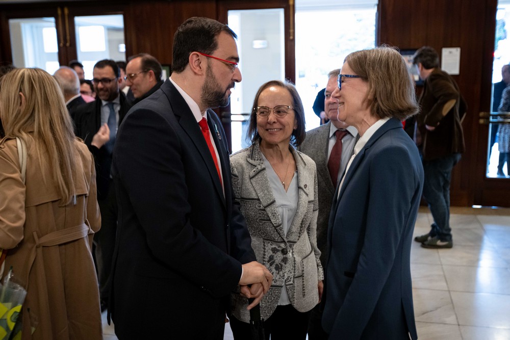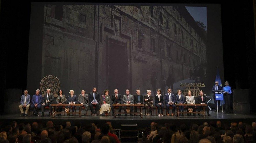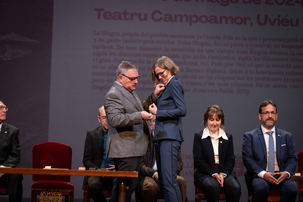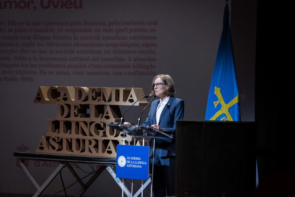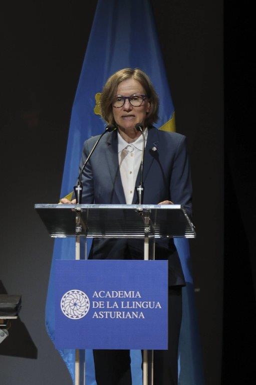 Selon ses statuts, l’ALLA comprend au maximum 25 membres numéraires ; cette année, deux sièges vacants ont été repourvus, par la nomination de la linguiste Claudia Elena Menéndez Fernández et de l’écrivain Pablo Rodríguez Medina. J’ai été émue par les discours de réception prononcés par les deux impétrants, qui ont souligné, chacun à sa manière, leur attachement à leur langue maternelle. Il faut souligner que, même si l’asturien connaît une tradition écrite ininterrompue depuis le 11ᵉ siècle, Pablo et Claudia font partie de la première génération d’Asturiens à pouvoir exprimer leur pensée en asturien dans toutes les sphères de la vie publique : par exemple, Claudia a rédigé et soutenu sa thèse en asturien.