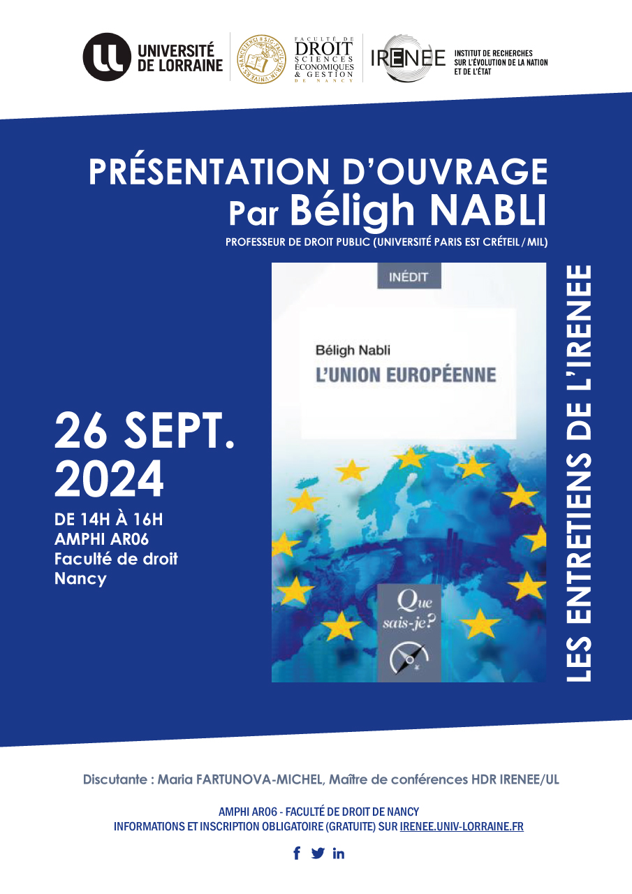 Présentation de l'ouvrage "L'Union européenne" (éd. Que sais-je ? 2024) par Béligh NABLI, Professeur de droit public (Université Paris Est Créteil / MIL).