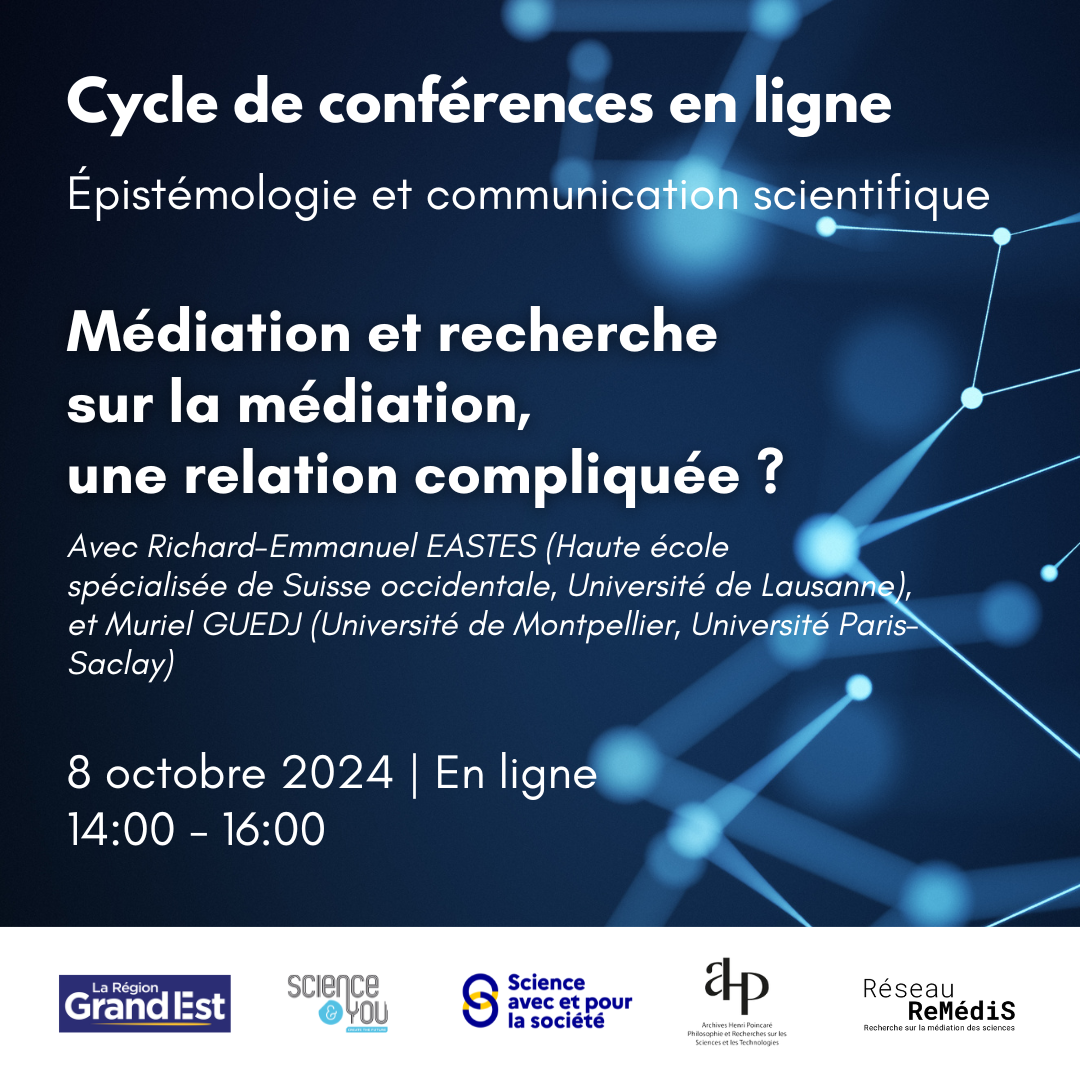 Retrouvez pour la troisième année le cycle de conférences en ligne élaboré par les Archives Henri-Poincaré et l'équipe Sciences Avec et pour la Société de l'Université de Lorraine. Ces "Rendez-vous de Science & You" s'adressent aux professionnels de la communication scientifique et aux personnes curieuses de comprendre ses enjeux. Elles réunissent des professionnels des disciplines suivantes : épistémologie, histoire, philosophie, sociologie...et médiation scientifique. Le but de ce cycle est de décloisonner le dialogue entre communautés de chercheur.e.s et de médiateur.rice.s scientifiques, confronter des manières de penser, parler de, représenter les sciences. Le réseau ReMédis s'associe à la diffusion de ces séances.