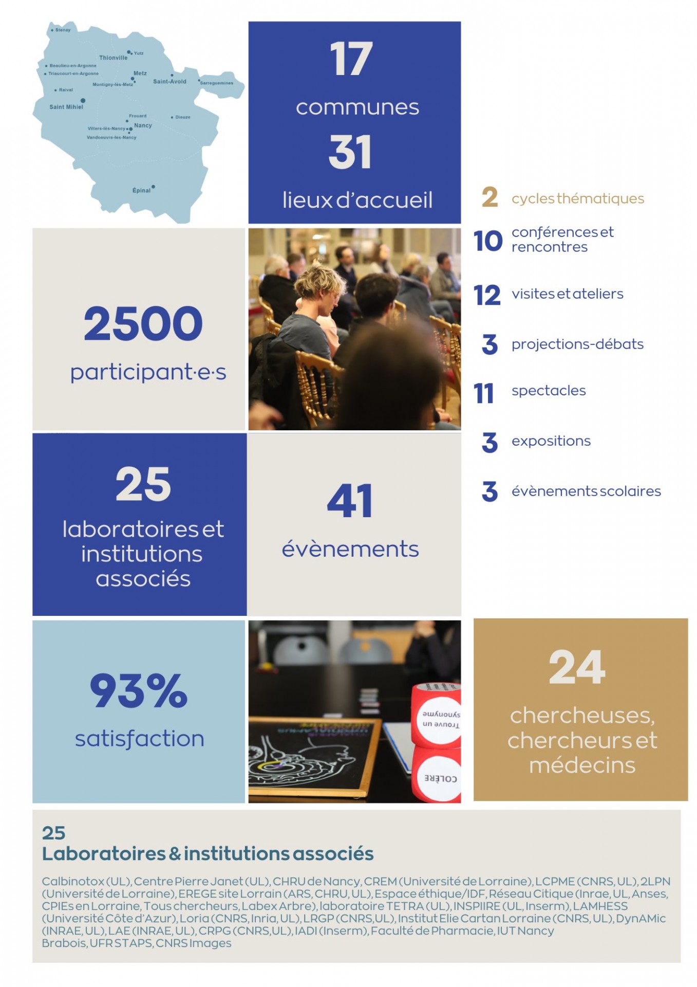 En 2024, un programme de rencontres et d’échanges avec des spécialistes a été mis en place sur les 10 anciens départements du Grand Est. Conférences, théâtre, spectacles, visites de laboratoire, projections débats, mais aussi évènements pour les scolaires se sont déroulés sur le territoire. Dans les 4 ex-départements lorrains, « À votre santé » a compté 41 évènements différents et 51 créneaux totaux dans sa programmation. Elle s’est déroulée dans 17 communes différentes mobilisant 24 chercheuses et chercheurs et 2500 spectateurs et spectatrices.