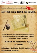 Dans le cadre des commémorations des 80 ans de la Libération de Nancy, l’association des Amis de la Bibliothèque américaine de Nancy propose le samedi 14 septembre 2024 une lecture dramatique « Lettres d’un temps de guerre » en partenariat avec la Ville de Nancy.