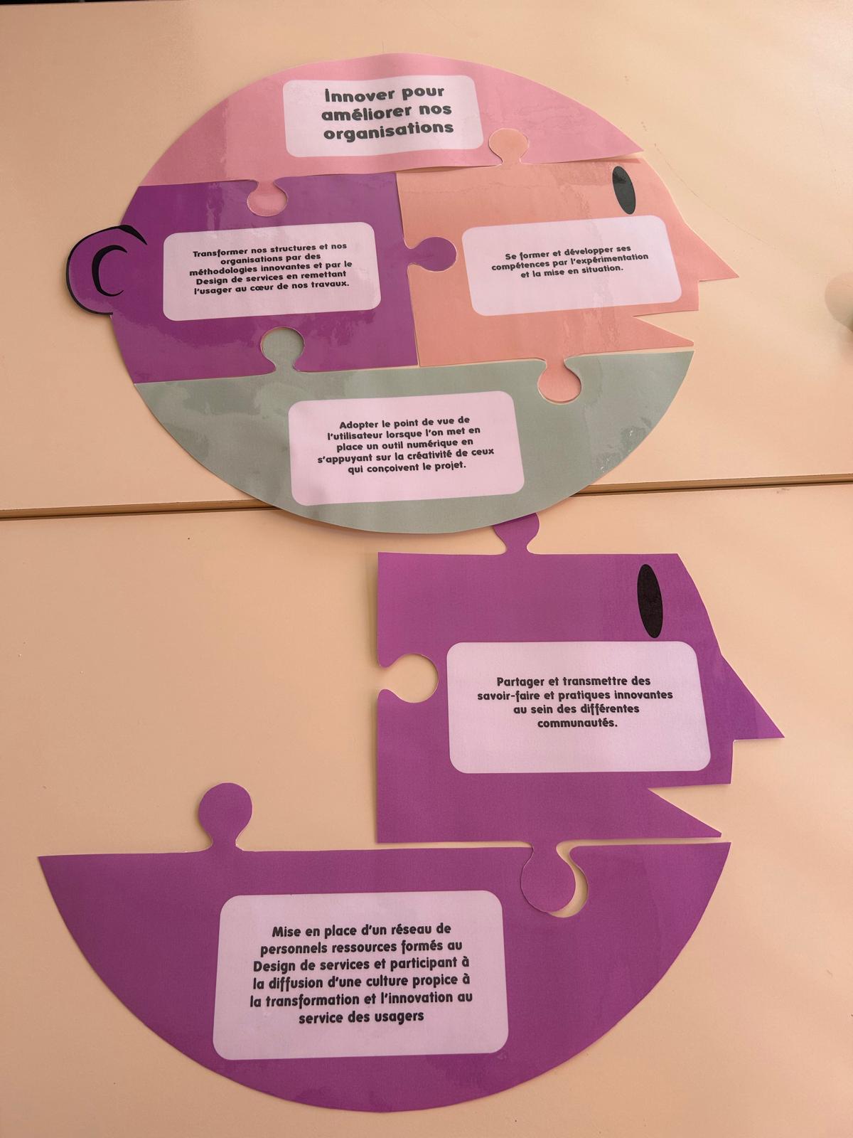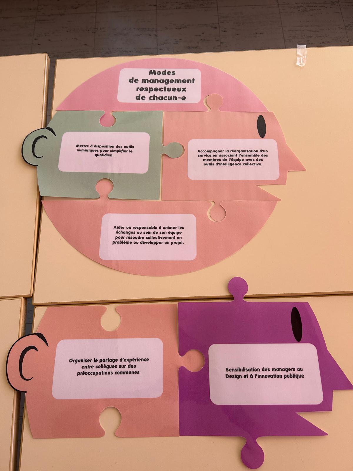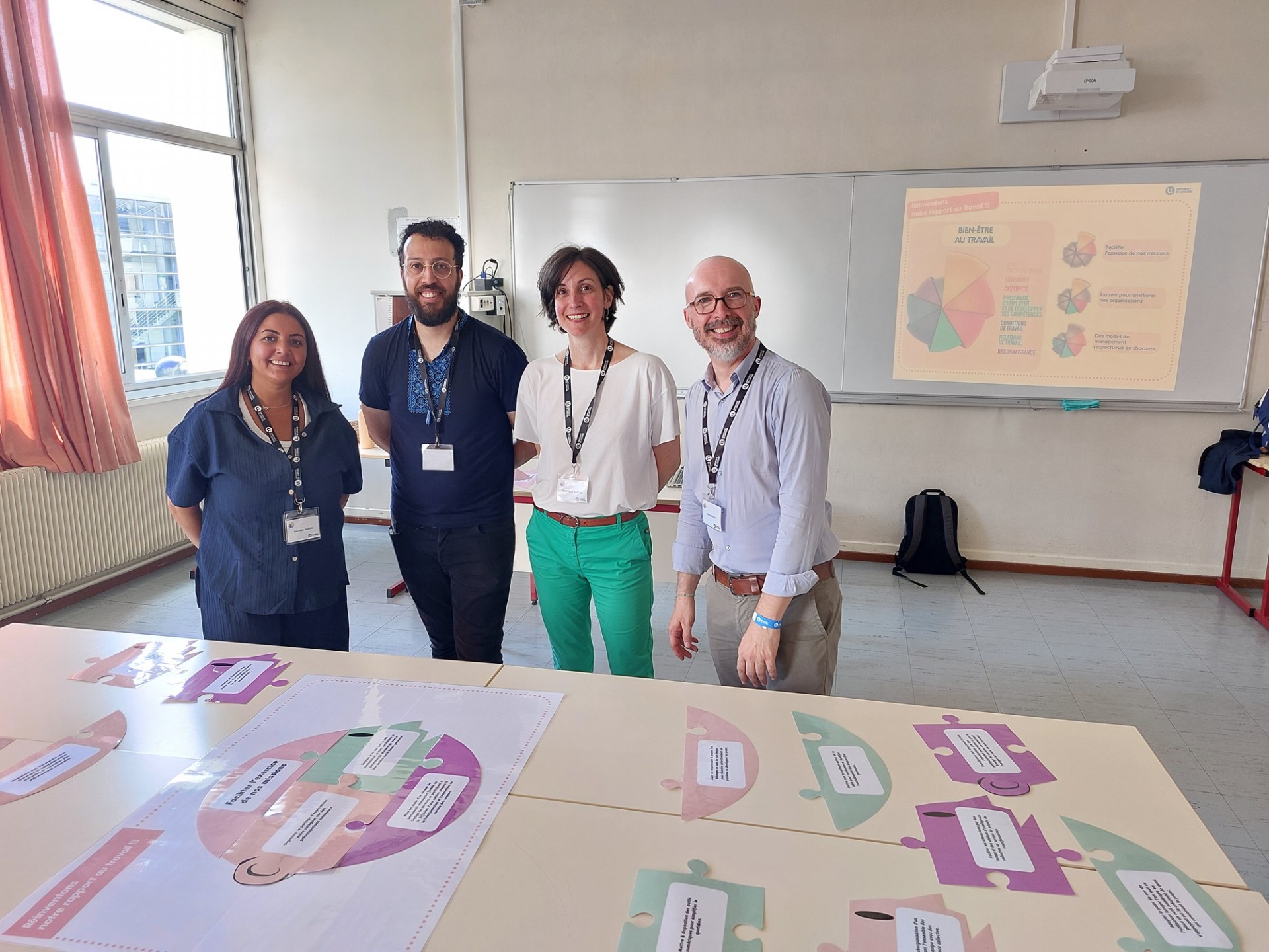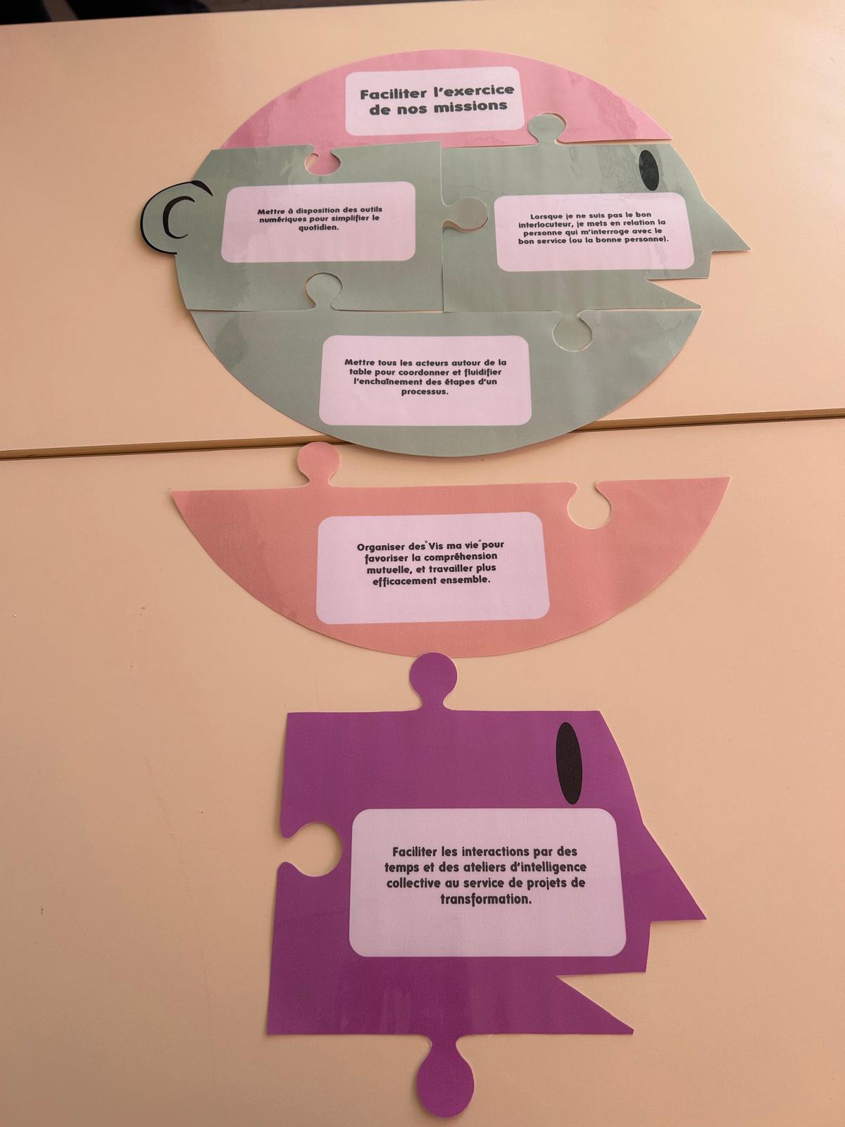 Dans le cadre de cet atelier, les axes 1,3 et 7 ont été abordés au moyen d’un jeu interactif qui demandait aux nouveaux personnels de reconstituer un puzzle de 4 pièces associant un axe à 3 actions possibles.