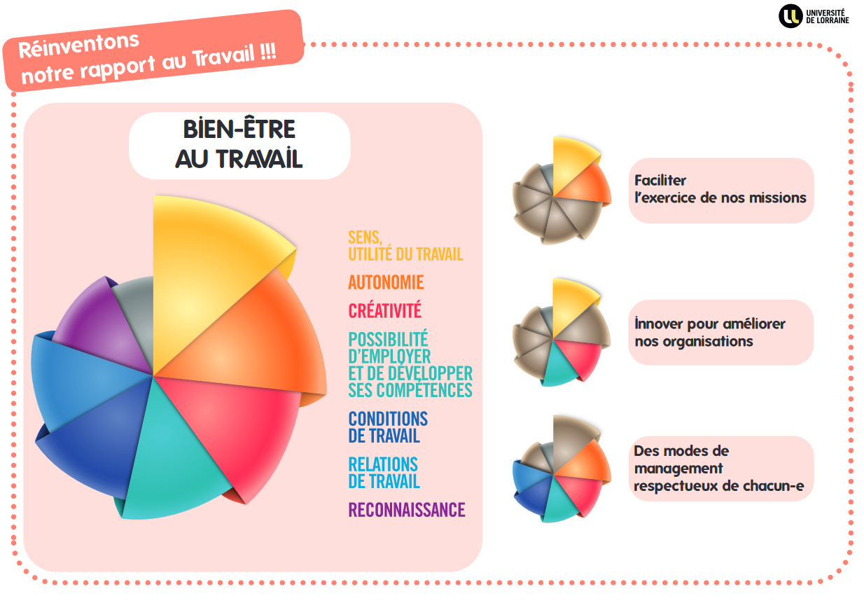 Toutes ces actions veulent agir sur les dimensions du bien-être au travail (représentées ci-contre), qui se répartissent dans 7 grands axes :