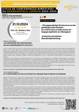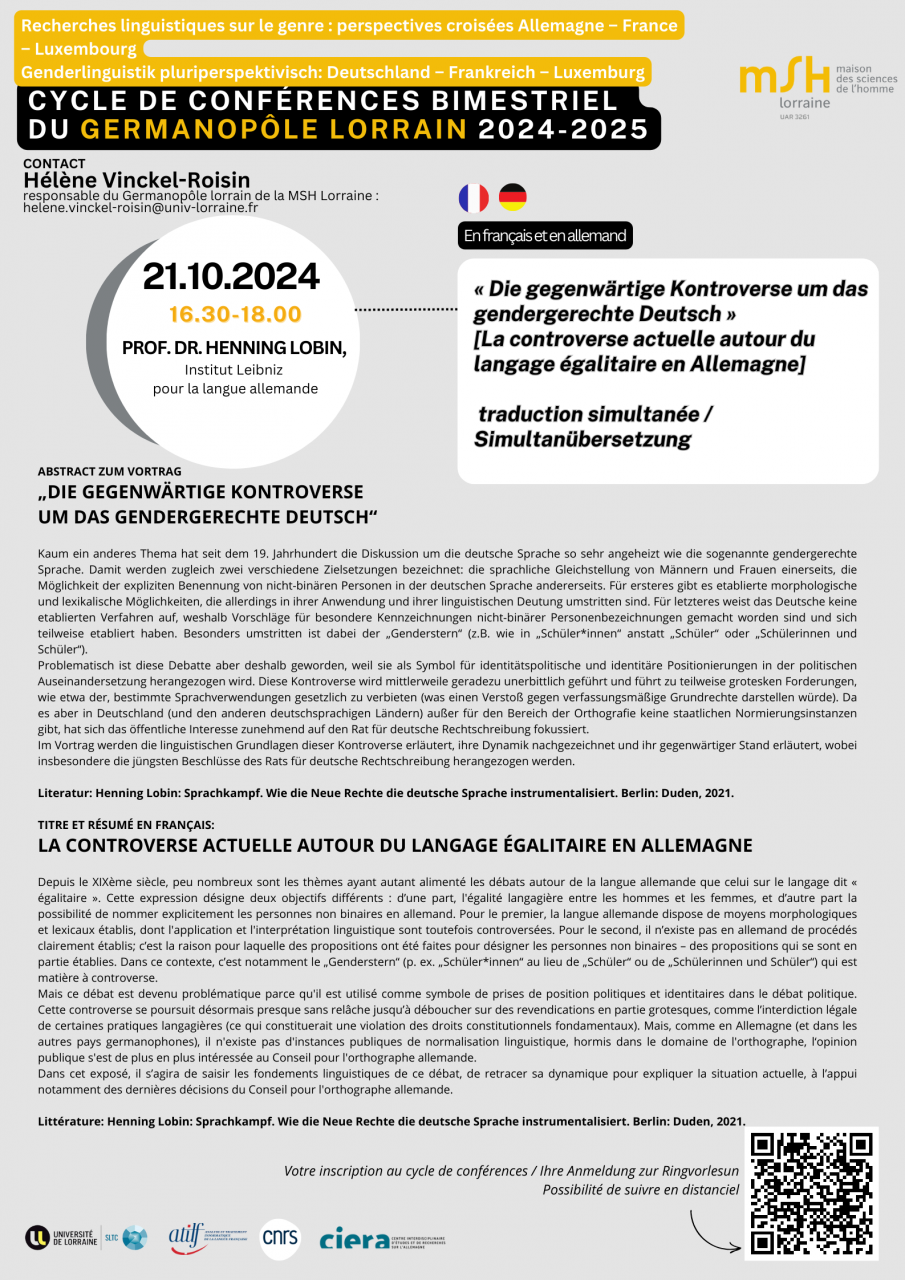 La première conférence aura lieu le 21.10.2024 – 16.30-18.00 : « Die gegenwärtige Kontroverse um das gendergerechte Deutsch » [La controverse actuelle autour de la langue allemande égalitaire en genre] – traduction simultanée / Simultanübersetzung