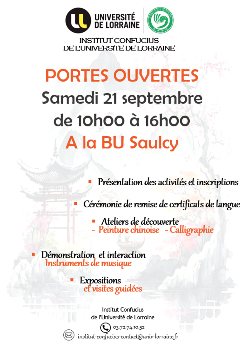 L'Institut Confucius de l'Université de Lorraine vous souhaite une excellente rentrée et a le plaisir de vous inviter à sa Journée Portes ouvertes samedi 21 septembre 2024.